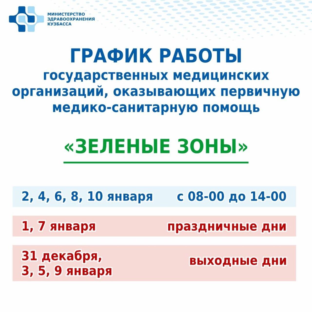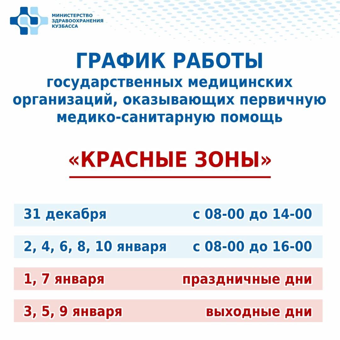 В министерстве здравоохранения Кузбасса рассказали, что в период новогодних праздников "зеленые" и "красные" зоны больниц будут работать по особому графику.