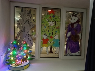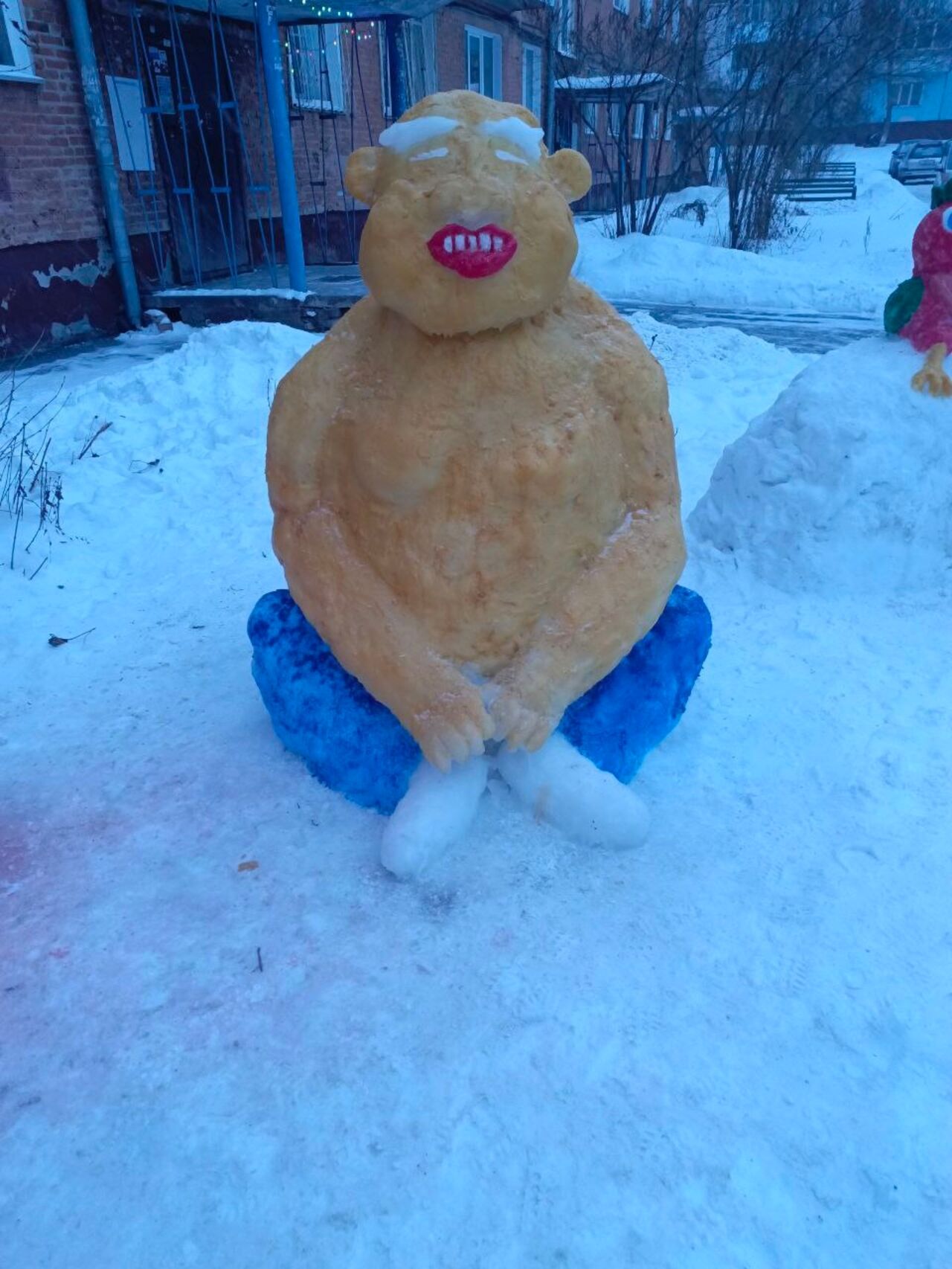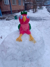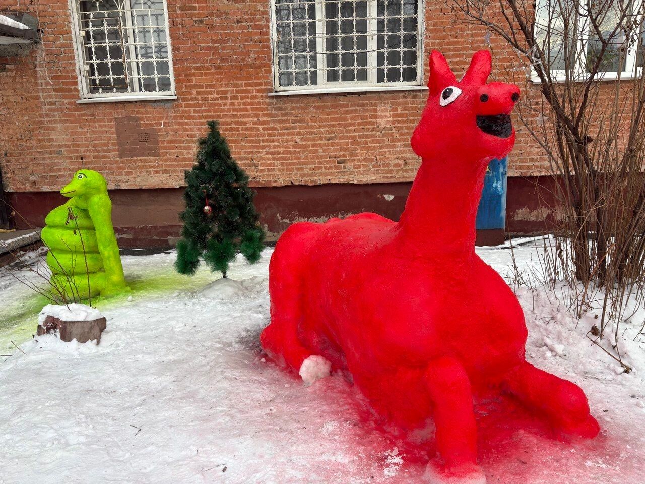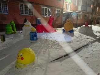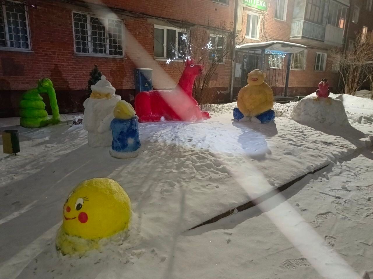 Сначала они всегда празднично оформляют окна своей квартиры, а потом всей семьей выходят на улицу лепить снежные фигуры. В этом году во дворе поселились Колобок, попугай Кеша, злой богатырь Тугарин и другие герои. Конечно, не обошлось и без главных символов праздника – Деда Мороза, Снегурочки и лошади.