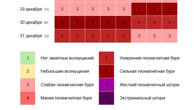 Согласно данным сервиса Time-in, возмущения начнутся вечером 29 декабря и быстро достигнут уровня сильной магнитной бури. Такая интенсивность сохранится большую часть 30 декабря. Только к вечеру вторника геомагнитная обстановка начнёт улучшаться, снизившись до умеренных колебаний. К 15:00 31 декабря, в самый канун Нового года, активность спадет до слабого уровня.