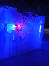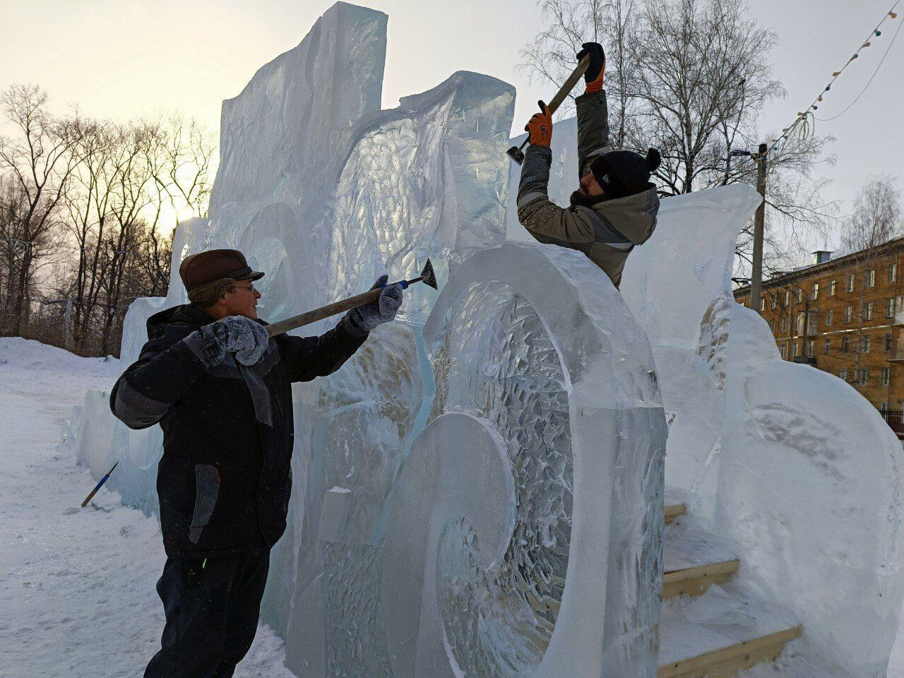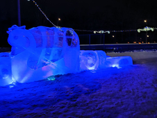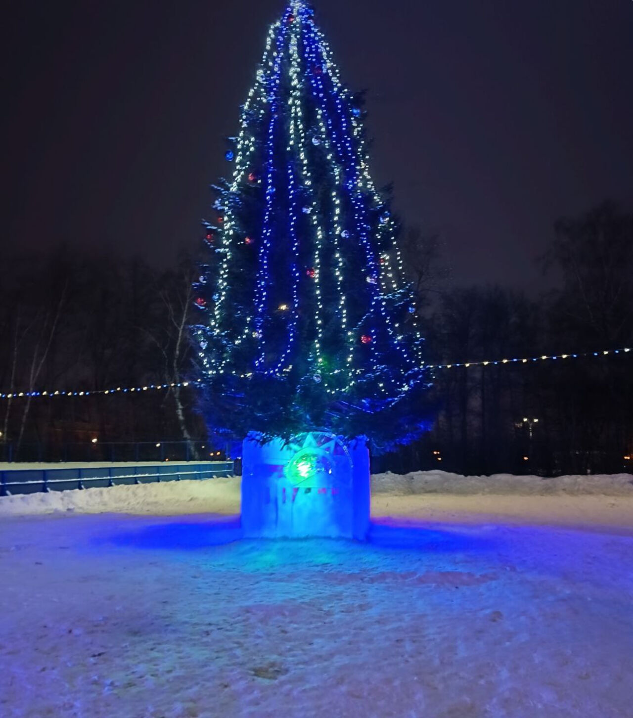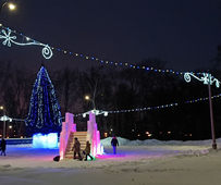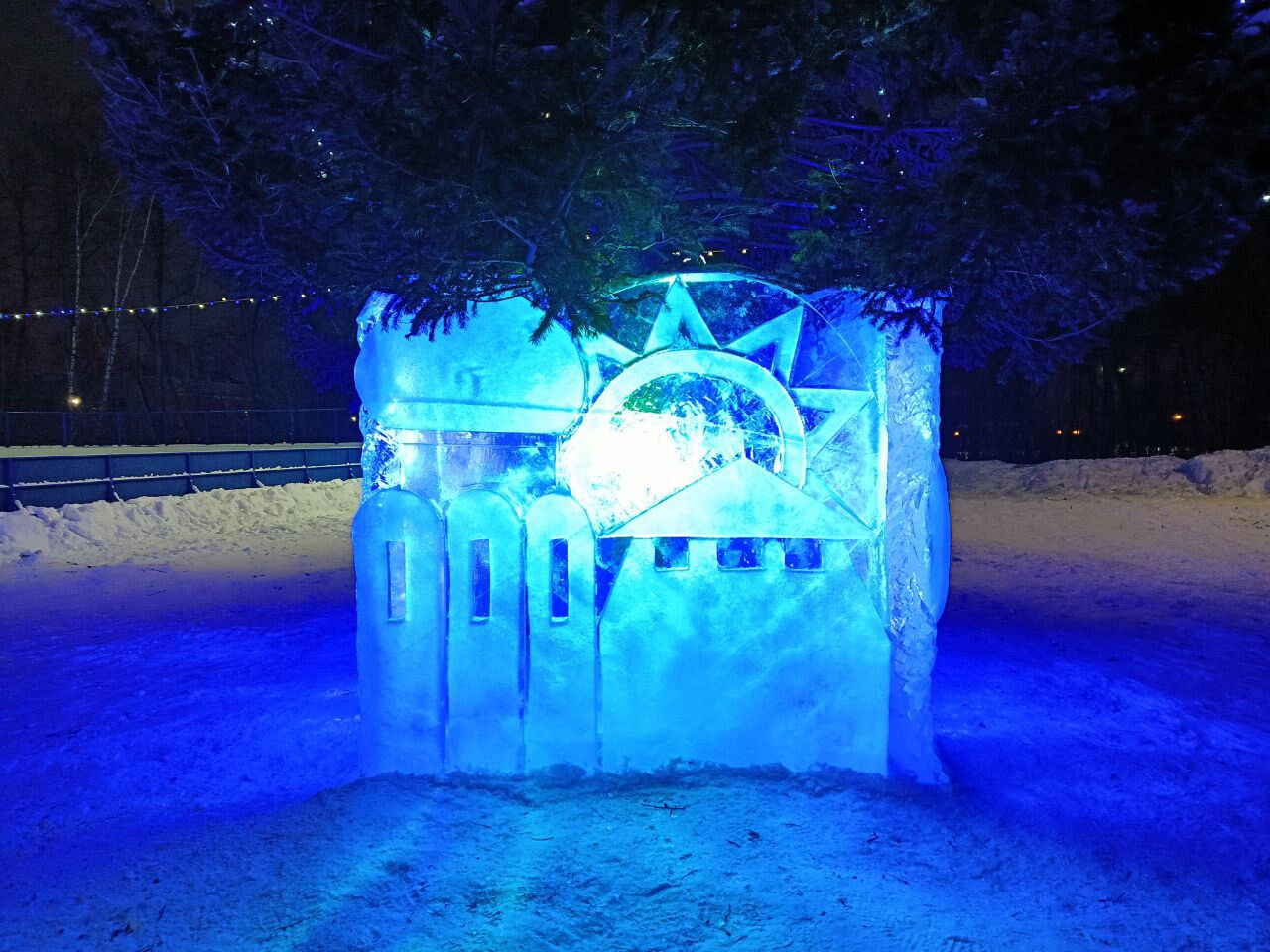 На ледяном ограждении ели нанесены резные изображения православного города с храмом и куполами, русскими узорами. На большой горке вырезаны фигуры коня и подковы, а маленькая получила форму хрустального лебедя. Дополняет сказочную атмосферу яркая иллюминация.