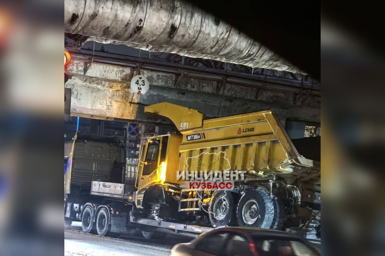 Вчера вечером в Кемерове "неожиданным гостем" для моста на Кузнецком проспекте стал самосвал на трале.