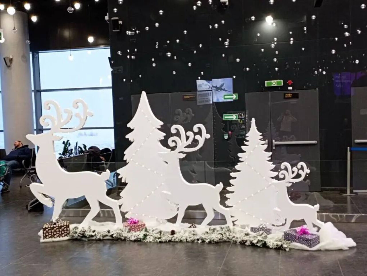В залах аэропорта поставили разнообразные праздничные украшения. В холле аэропорта установили новогоднюю ёлку, по традиции обильно украшенную гирляндами и цветными шарами. В зале ожидания расположили белые фигуры оленей огоньками и подарочными коробками, а на стойках регистрации расставили наряженные ёлки-малышки.