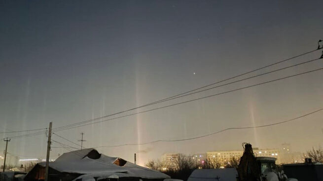 Как пояснил автор, эти "столбы" не что иное, как оптический эффект. Он возникает, когда свет отражается от плоских ледяных кристаллов в воздухе. Из-за этого кажется, будто в небе стоят большие светящиеся столбы.
