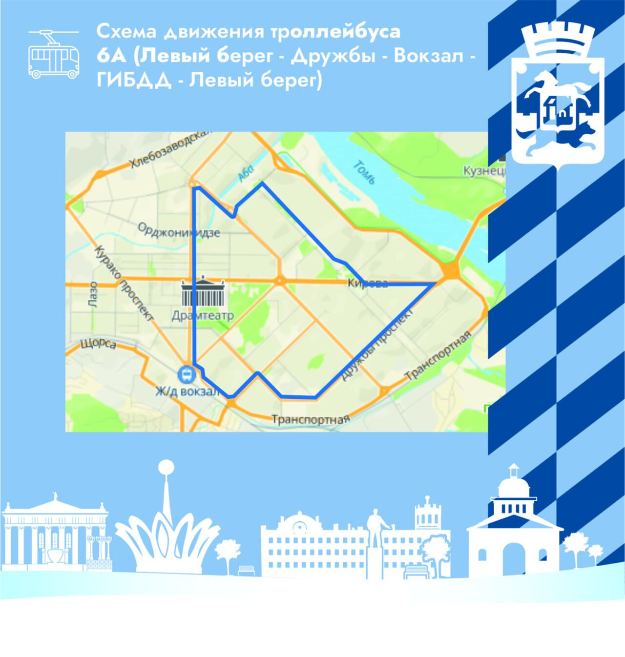 Троллейбус №6А начнёт ходить по иной схеме: Левый берег – Дружбы – Транспортная – Вокзал – Металлургов – ГИБДД – Кузнецкстроевский – Павловского – Ермакова – Левый берег.