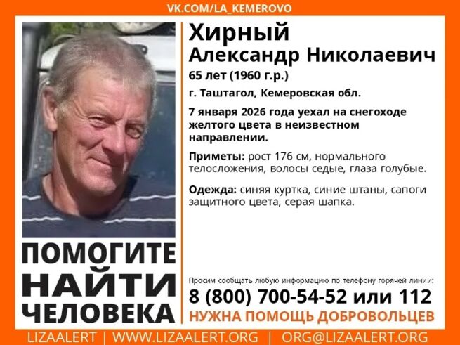 Волонтеры ПСО "ЛизаАлерт" сообщили, что в Таштаголе пропал 65-летний Хирный Александр Николаевич. Сообщается, что 7 января он уехал на желтом снегоходе в неизвестном направлении.