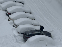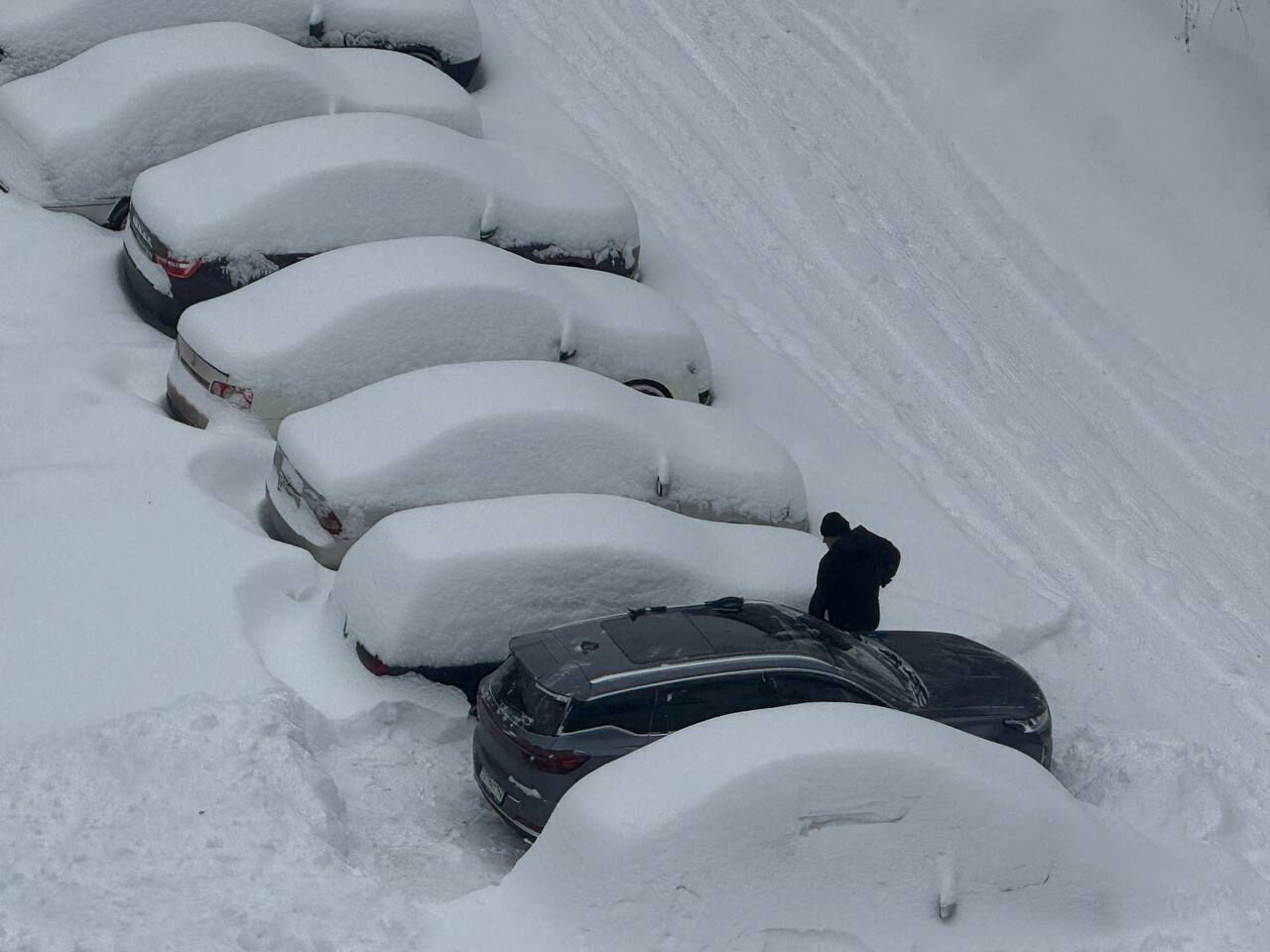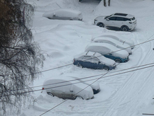 Дороги и тротуары начисто скрывают тонны выпавшего снега. Даже машины становятся всё менее незаметными на фоне сугробов. Для машин проезд затруднён, а пешеходам и вовсе приходится передвигаться "вразвалочку".