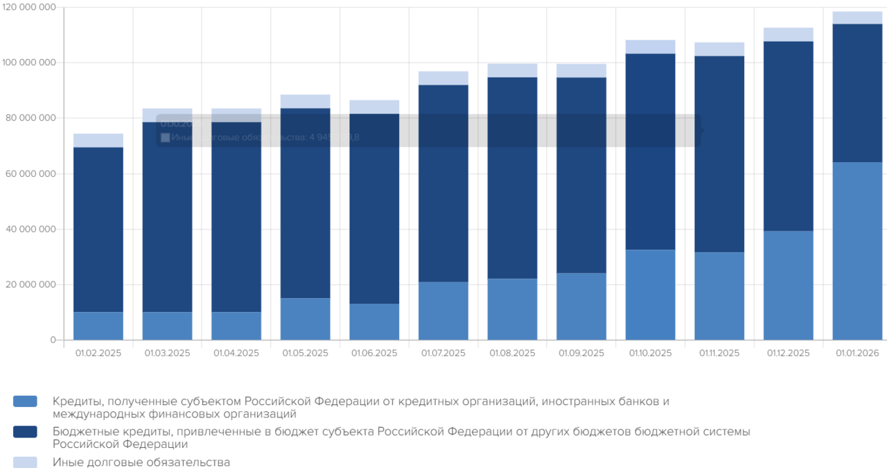 Из указанной суммы 64,1 млрд рублей приходится на кредиты от банков, 49,9 млрд рублей – бюджетные кредиты от других бюджетов, а 4,49 млрд – на иные долговые обязательства.