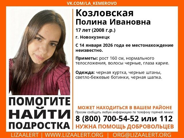 Волонтеры ПСО "ЛизаАлерт" сообщили, что в Новокузнецке пропала 17-летняя Козловская Полина Ивановна. Местонахождение девочки остается неизвестным с 14 января.