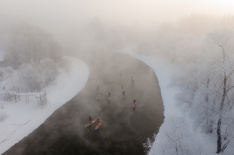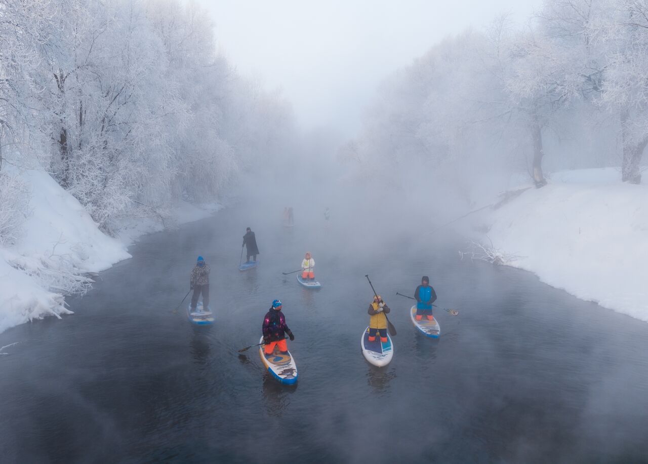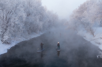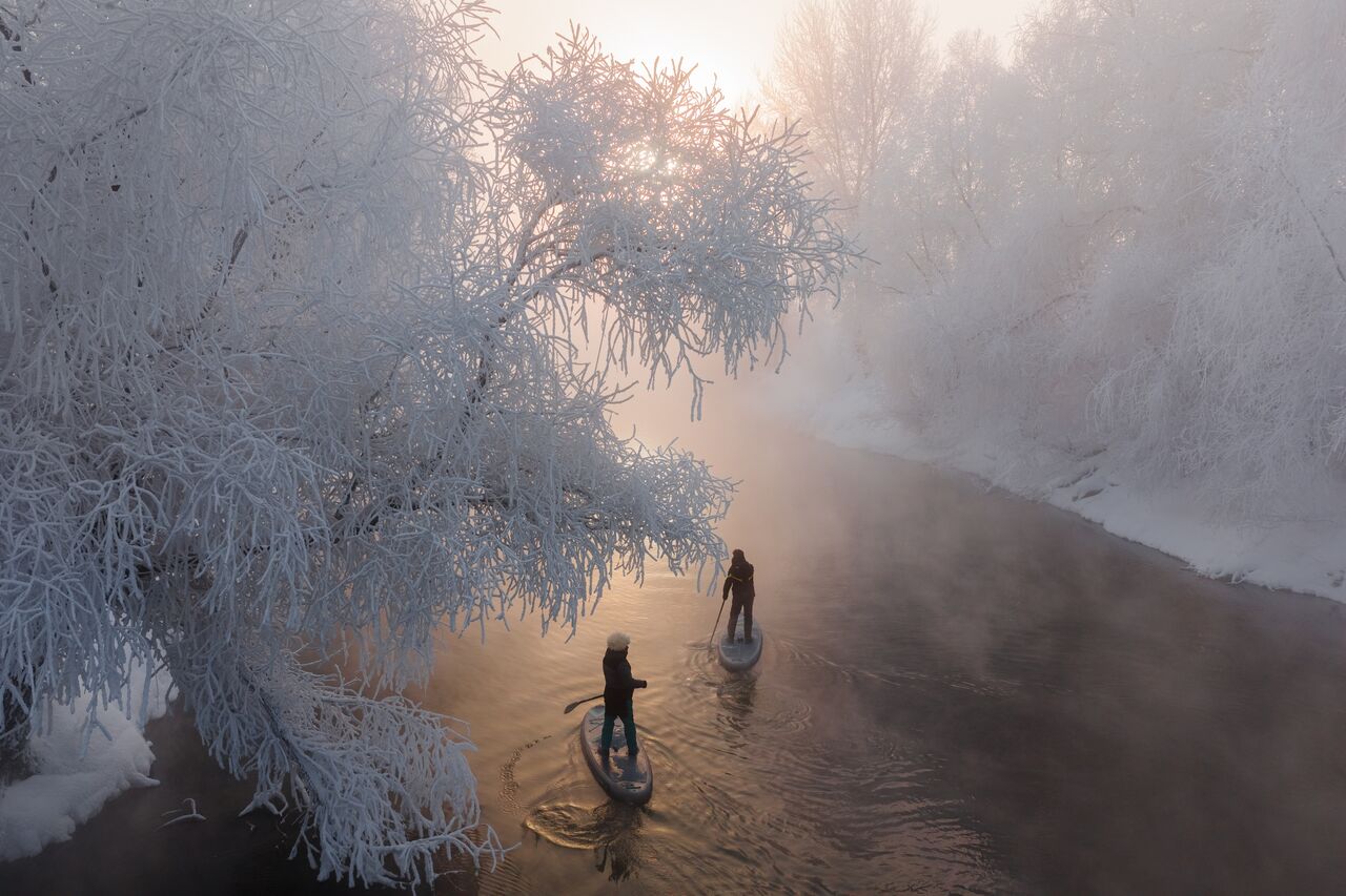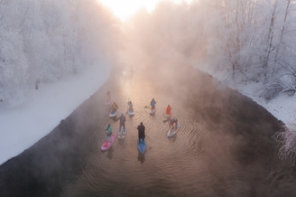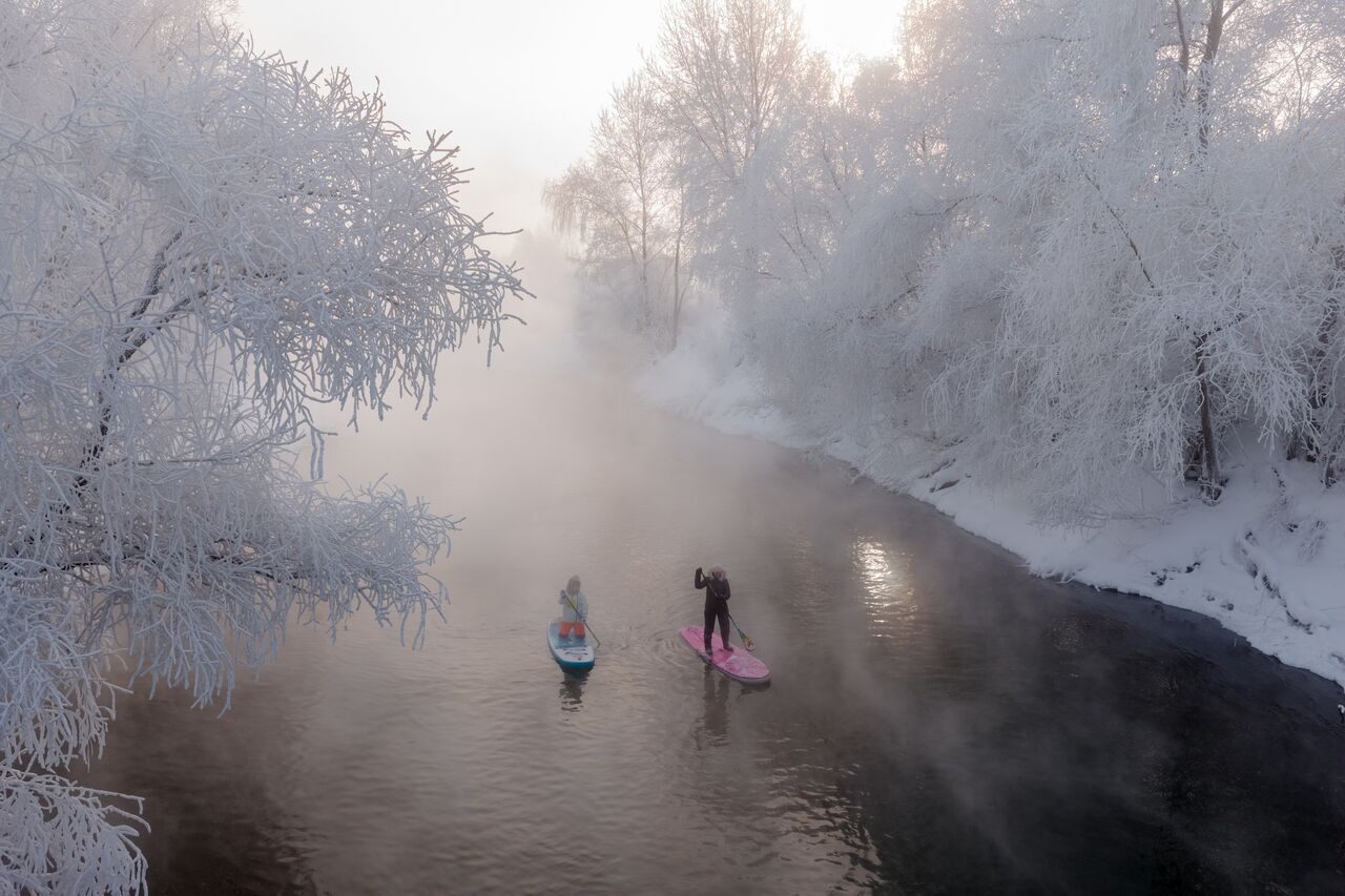 Новосибирские экстремалы устроили в 40-градусный мороз заплыв на сапах по протоке Оби, сообщает КП-Новосибирск. Результат запечатлел на камеру фотограф Вадим Махоров. Как он объяснил изданию, это место не промерзает, потому что туда сбрасывает воду ТЭЦ.