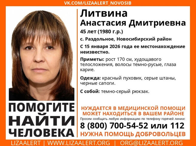 Анастасия Литвина – жительница села Раздольное Новосибирской области – пропала вечером 15 января. Последним человеком, который видел ее, стала подруга, у которой женщина временно жила. По словам женщины, в тот день Анастасия резко куда-то засобиралась, попросила денег в долг, села в какую-то машину, которая подъехала к дому, и уехала.