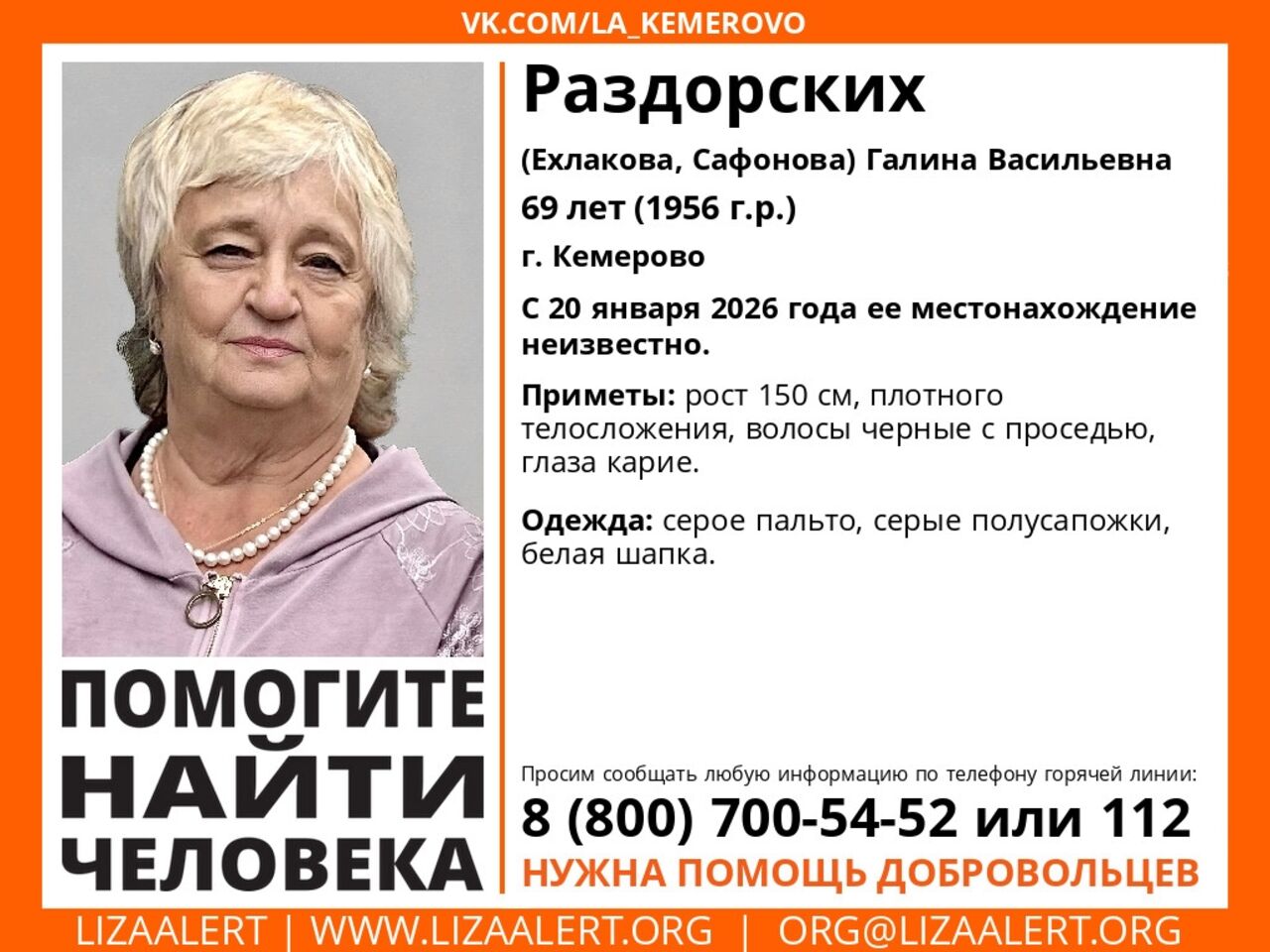 – В городе Кемерово в Кировском районе по улицам Халтурина, Инициативной, Обнорского, Тургенева установлено большое количество камер видеонаблюдения. Записи с них помогут установить маршрут передвижения Галины Николаевны в период с 10:00 до 16:00 20 января 2026 года, – продолжили волонтеры.