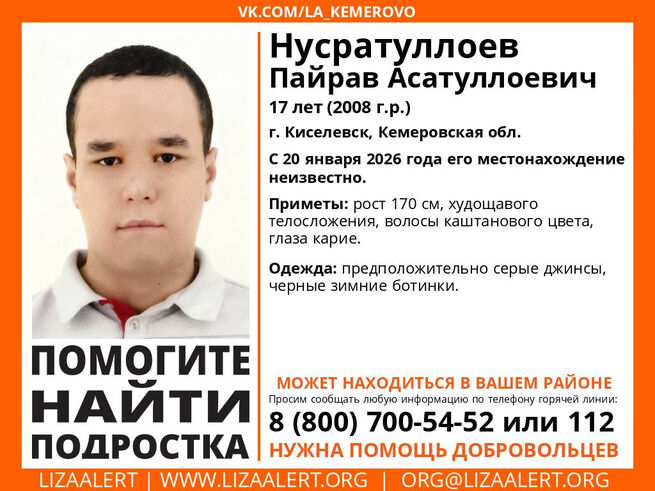 Поисковый отряд "ЛизаАлерт" опубликовала ориентировку на 17-летнего подростка из Киселёвка. Там пропал Пайрав Нусратуллоев.