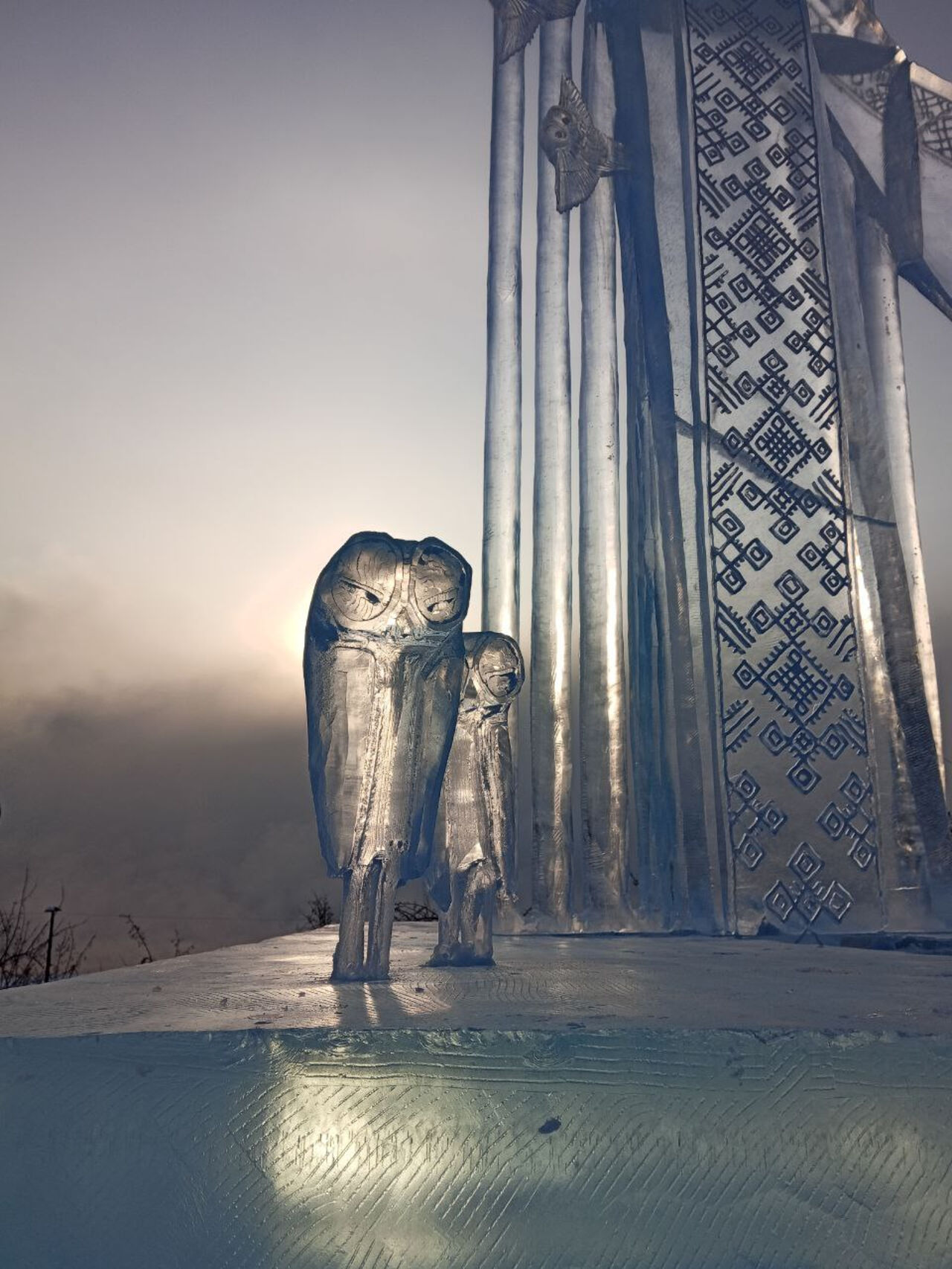 – Берегиня как бы закрывает руками деревню от снега и дождей, а фатой – от ветров, благодаря чему дым от изб идёт вертикально вверх. Также в скульптуре представлены совы – птицы, которые следят за порядком ночью, – сказал мастер.