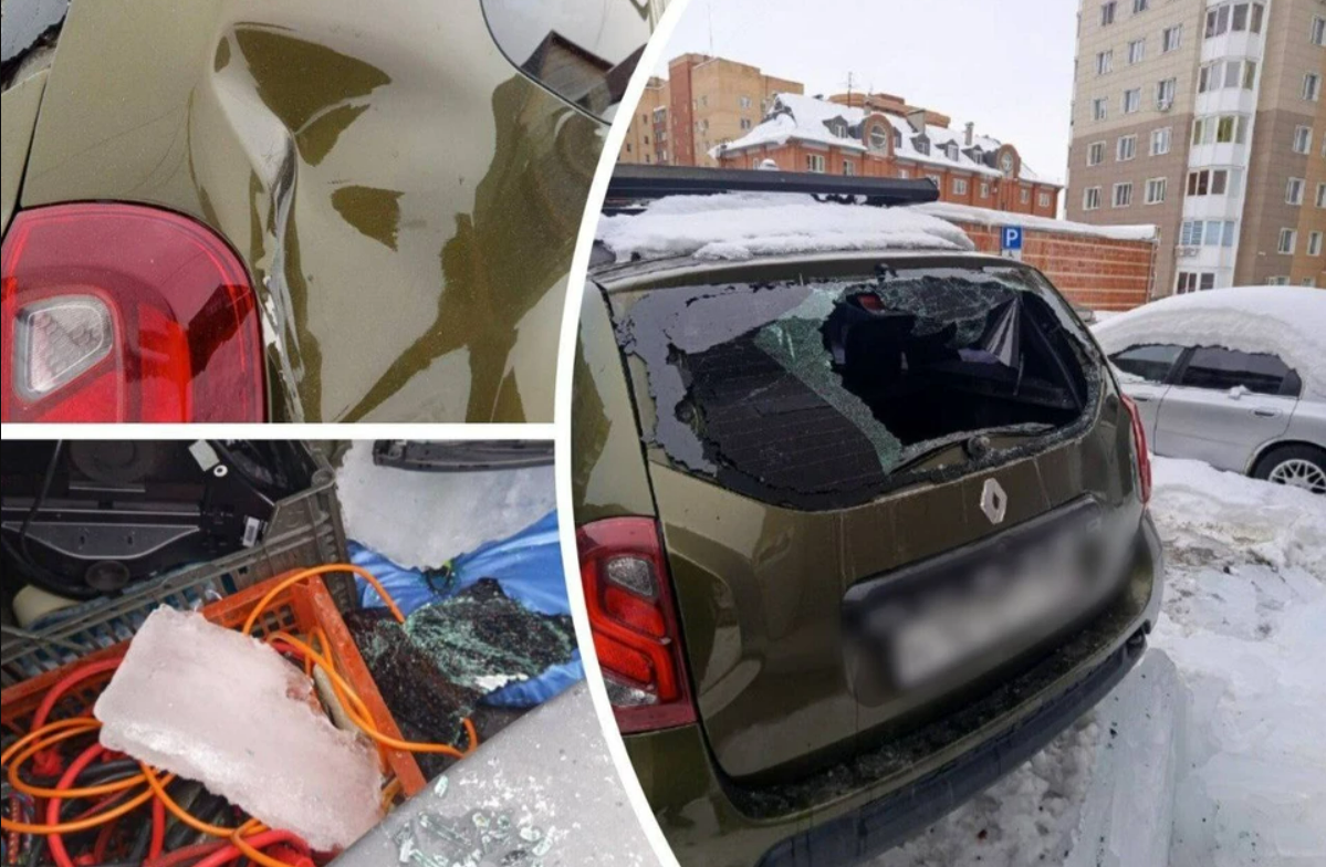 В Новосибирске на улице Богдана Хмельницкого ледяная глыба упала с крыши здания и серьезно повредила кроссовер Renault Duster.