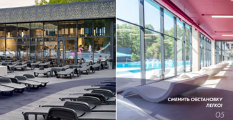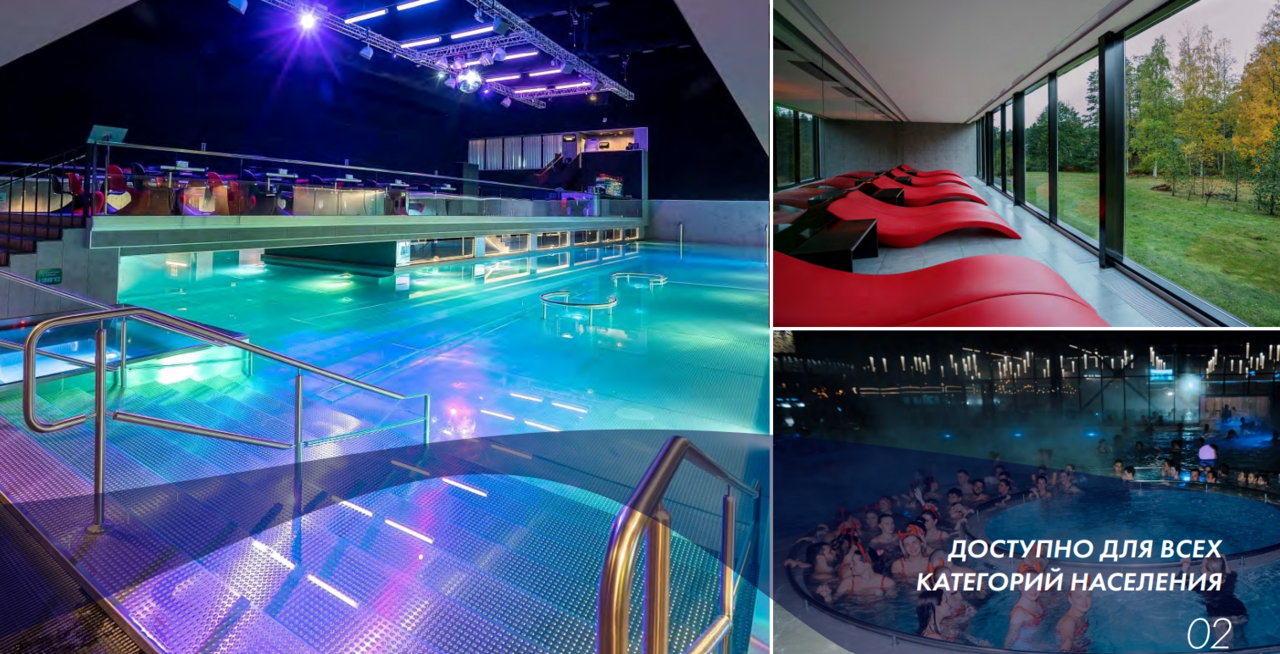 Также представлены эскизы с будущим обликом объекта – бассейны под открытым небом и в помещении, зоны отдыха со скамейками как внутри, так и снаружи, водные аттракционы, кафе и прочее.