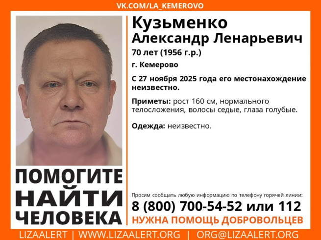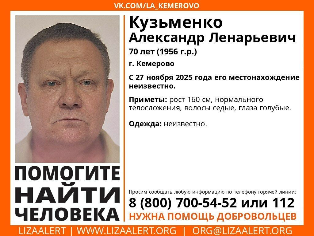 Волонтеры ПСО "ЛизаАлерт" сообщили, что в Кемерове пропал 70-летний Кузьменко Александр Ленарьевич. С 27 ноября 2025 года его местонахождение неизвестно.