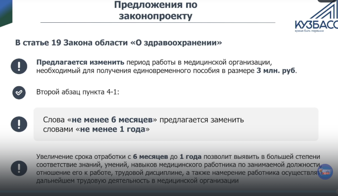 Авторы предлагают внести изменения в кузбасский закон о "Здравоохранении", чтобы медики, которые устраиваются на работу по программе замещения дефицитных специальностей и получают единовременное пособие в размере 3 млн рублей, должны были по договору отработать минимум год, а не шесть месяцев, как сейчас.