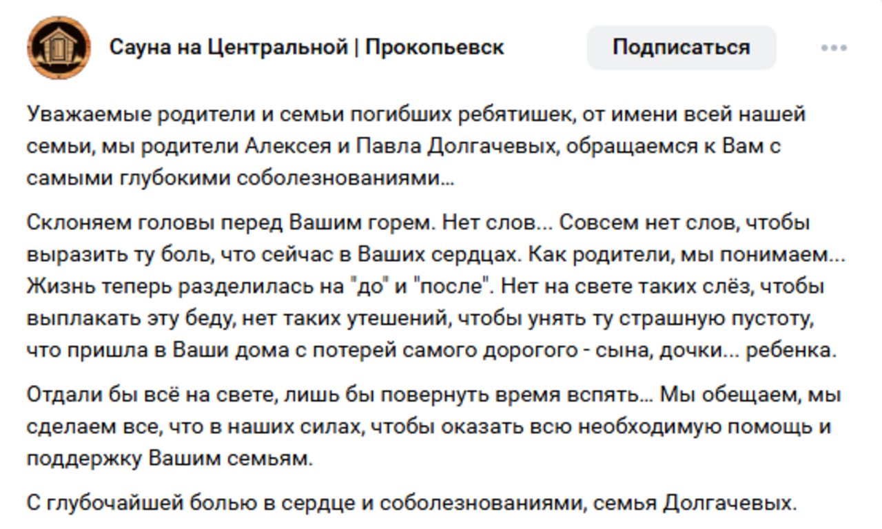 В паблике прокопьевской сауны появилось обращение отца и матери хозяев заведения, в котором выражают соболезнования.