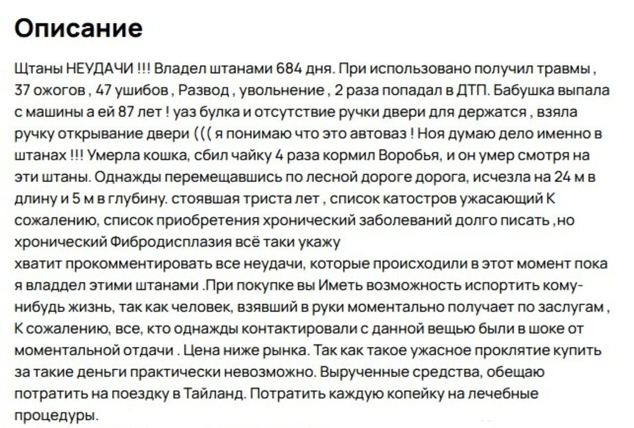 На одном из российских онлайн-маркетплейсов появилось странное объявление: житель Южно-Сахалинска продаёт так называемые "штаны неудачи" за 1 млн рублей. Судя по описанию, это не просто вещь, а настоящий генератор проблем, который почти за два года владения умудрился основательно испортить автору жизнь.