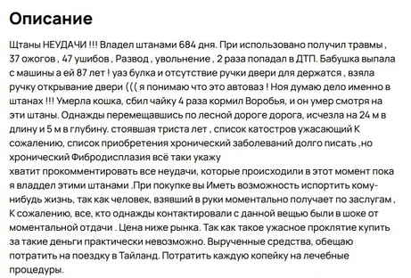 Продавец эмоционально и не без опечаток делится историей длиной в 684 дня, за которые, по его словам, брюки притянули целый ворох бед. Перечень случившегося выглядит впечатляюще: