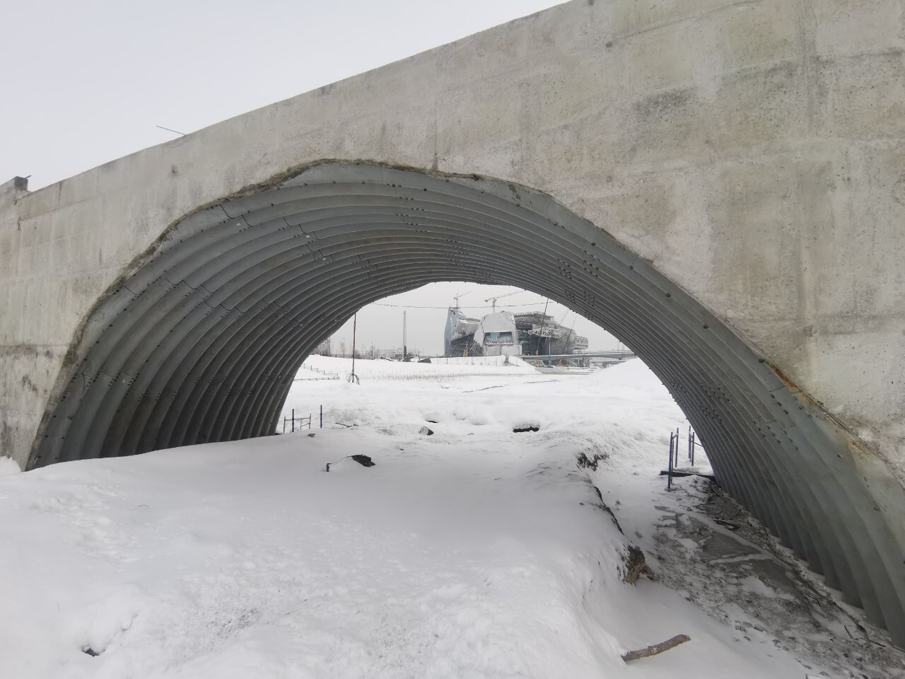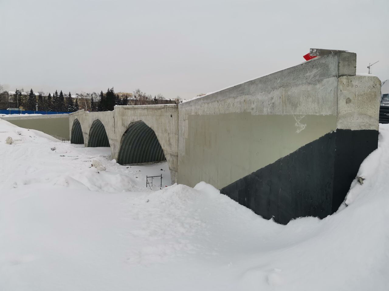 У моста уже смонтированы арочные пролёты, готовы монолитные подпорные стенки, отсыпано щебнем верхнее полотно. Начинается прокладка электрических сетей. В скором времени стартует монтаж балконных плит с обеих сторон.