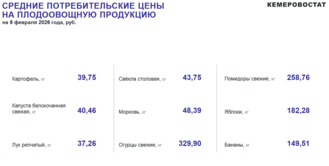 По данным Кемеровостата, с 2 по 9 февраля в регионе сильнее всего прибавили в стоимости огурцы (+6,6%), сосиски (+3,4%), яблоки (+2,7%), бананы и свёкла (+2,6%), капуста (+2,4%). Консервы для детского питания подорожали на 3-4%.
