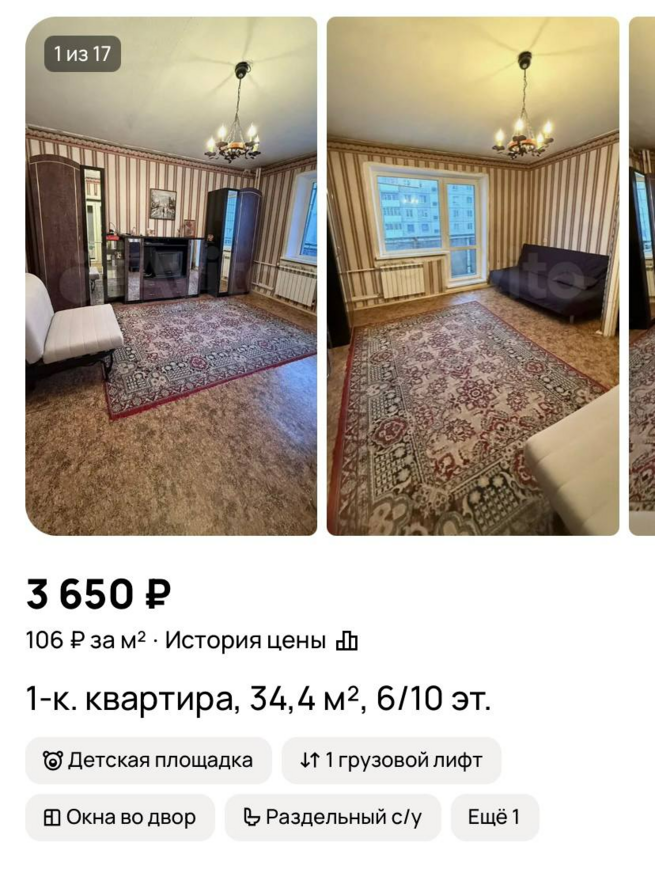 Квартира расположена в хорошем районе города на 6 этаже десятиэтажного дома. Площадь – 34,4 м². Цена поражает – всего 3 650 рублей, или 106 рублей за квадратный метр.