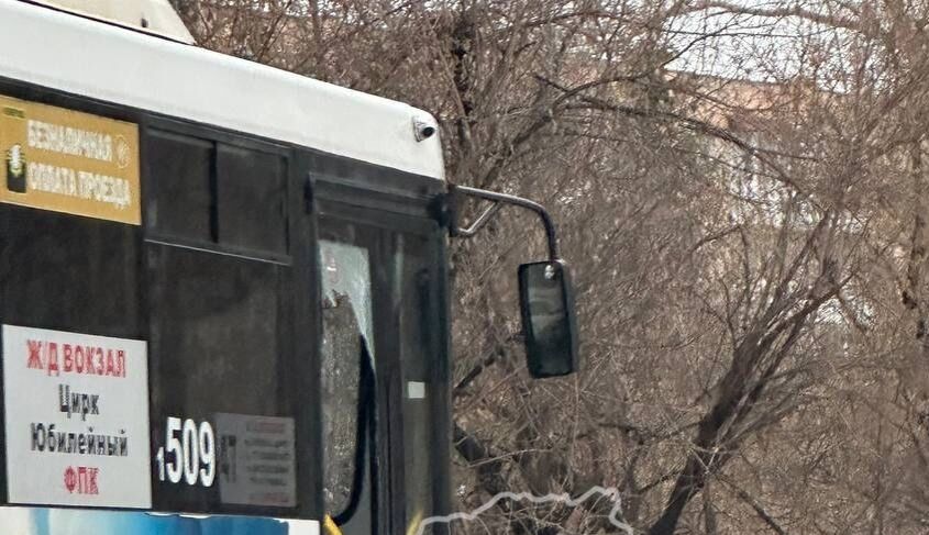 На опубликованном снимке запечатлён автобус с лопнувшим стеклом на входной двери.