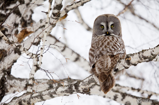 Подписчик телеграм-канала "Типичный Кемерово" прислал видео, в котором птица спокойно и величественно сидит на сугробе, а затем поворачивает голову и фиксирует взгляд прямо в камеру.
