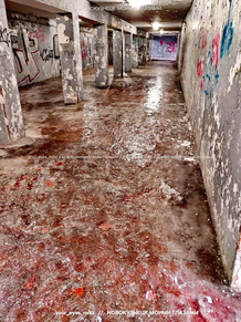 Увиденное не оставило комментаторов равнодушными. Они отмечают, что ободранные, осыпавшиеся стены, надписи, грязное месиво на красном фоне – это готовые декорации к хоррору.