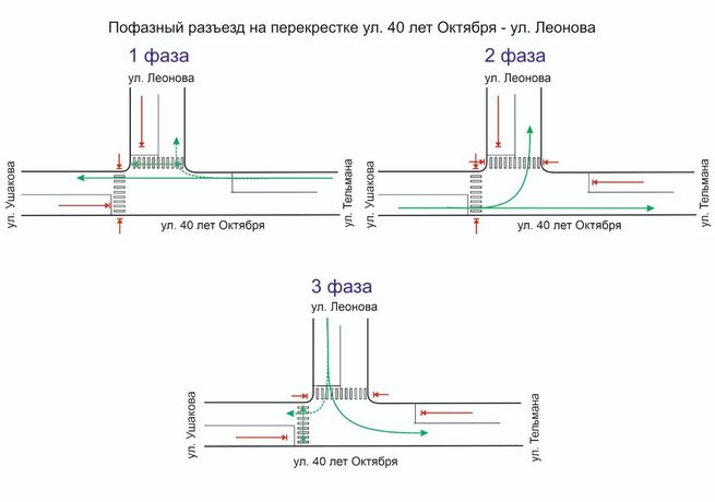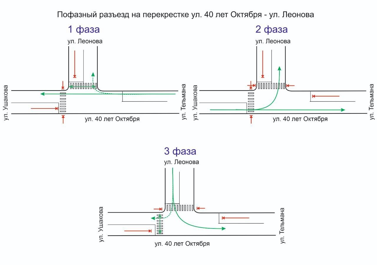 - 1 фаза – движение транспорта будет осуществляться по ул. 40 лет Октября от ул. Тельмана и пешеходов через ул. Леонова;