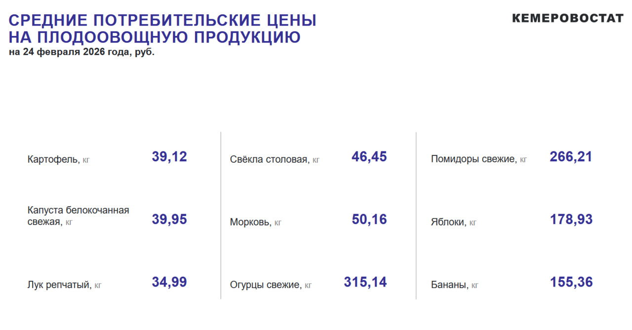 По данным Кемеровостата, с 17 по 24 февраля в Кузбассе стали дороже такие продукты, как бананы (+4,8%), свёкла (+4,6%), яйца (+3,7%), морковь (+3,5%), помидоры (+3,2%), мука (+2,7%).