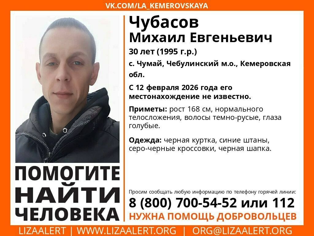 Волонтеры ПСО "ЛизаАлерт" сообщили, что в Чебулинском муниципальном округе пропал 30-летний Чубасов Михаил Евгеньевич. С 12 февраля 2026 года его местонахождение неизвестно.