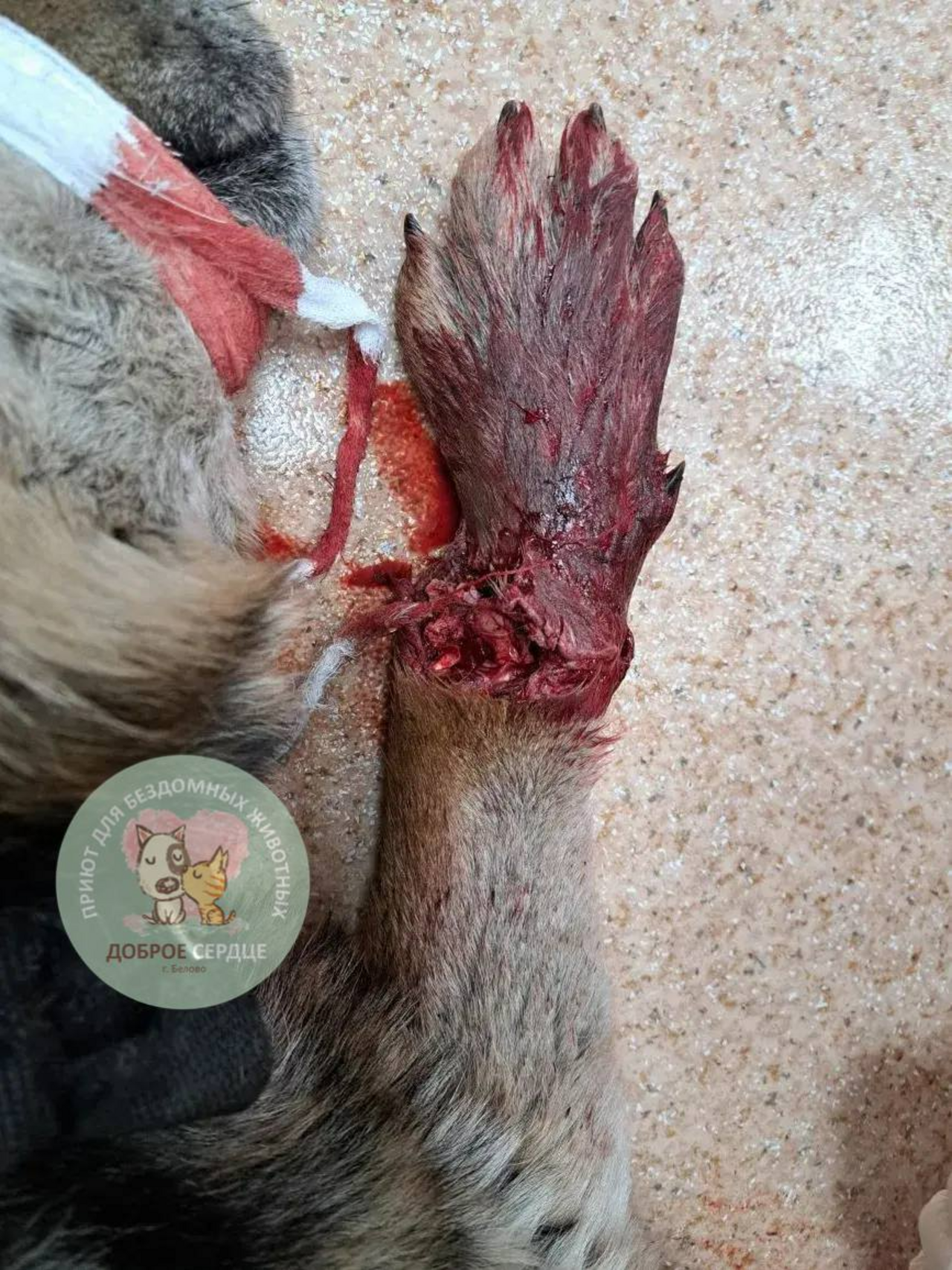 Как сообщает читатель телеграм-канала "Типичное Белово", лапу собаке сохранить не удалось, а на морде ветеринарам пришлось зашивать челюстные мышцы. Пес был в ошейнике, что говорит о наличии хозяина, но, по всей видимости, мог потеряться.