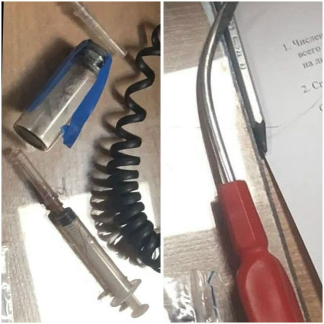 Во время досмотра в сумке посетителя был обнаружен скрытый "потайной карман". В нем находились шприц, игла для шприца, флакон с неизвестным веществом, отвертка с изогнутым концом и расфасованные по пакетикам таблетки – все это запрещено к проносу в судебные здания.