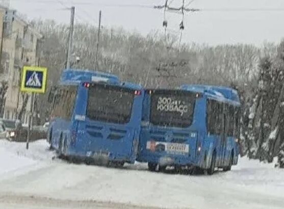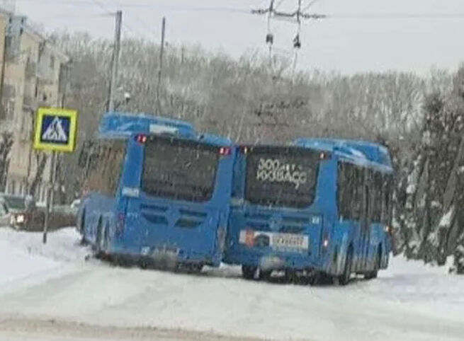 В Новокузнецке произошло необычное ДТП: два автобуса одного маршрута не поделили дорогу на улице Кутузова. В результате столкновения транспортные средства перегородили проезжую часть полностью. Об этом сообщает телеграм-канал "ДТП Кузбасс".