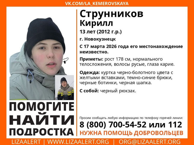 Волонтеры ПСО "ЛизаАлерт" сообщили, что в Новокузнецке пропал 13-летний Струнников Кирилл. С 17 марта 2026 года его местонахождение неизвестно.