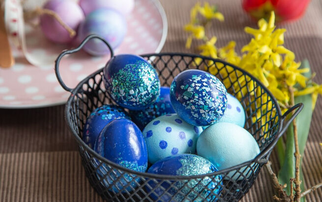 Основной краситель готовят как обычно. В дополнительные цвета добавляют растительное масло: чем его больше, тем мельче получатся пятнышки. Сначала яйцо красят в базовый цвет. Потом опускают в краситель с маслом и держат несколько секунд. Из-за масла краска ложится неравномерно, и на скорлупе появляются красивые мраморные разводы.