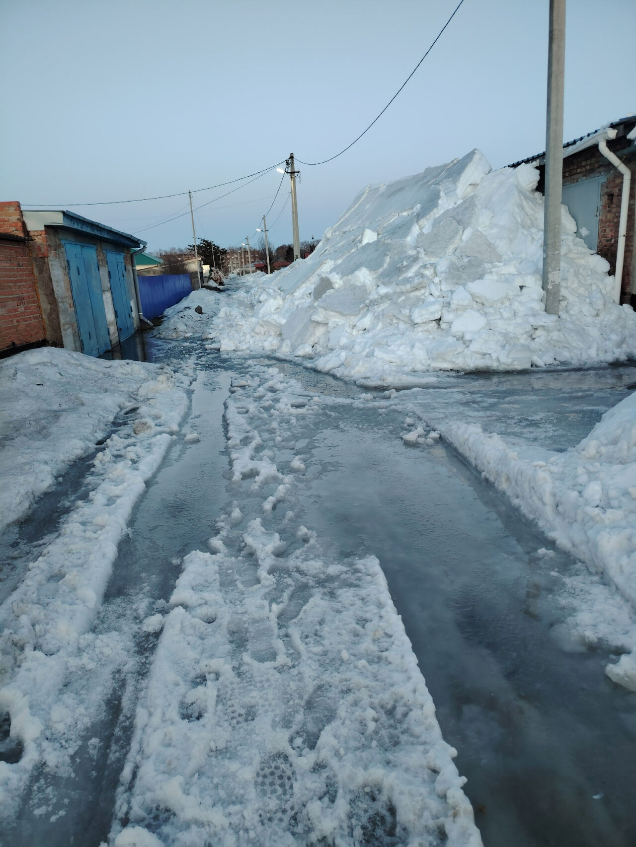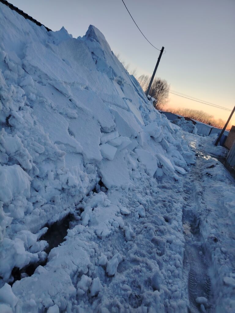 Речь идет о переулке Советском. На кадрах видно настоящий "царь-сугроб" – снежная масса выше гаражей с крупными кусками наста перекрыла половину дороги.