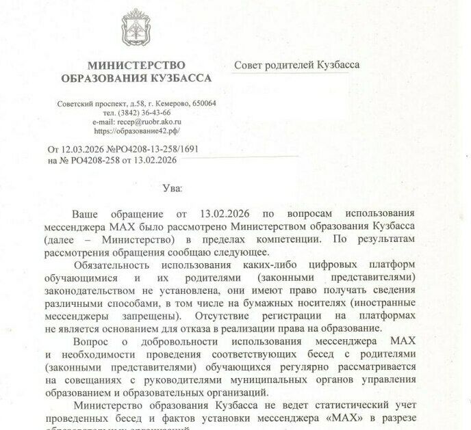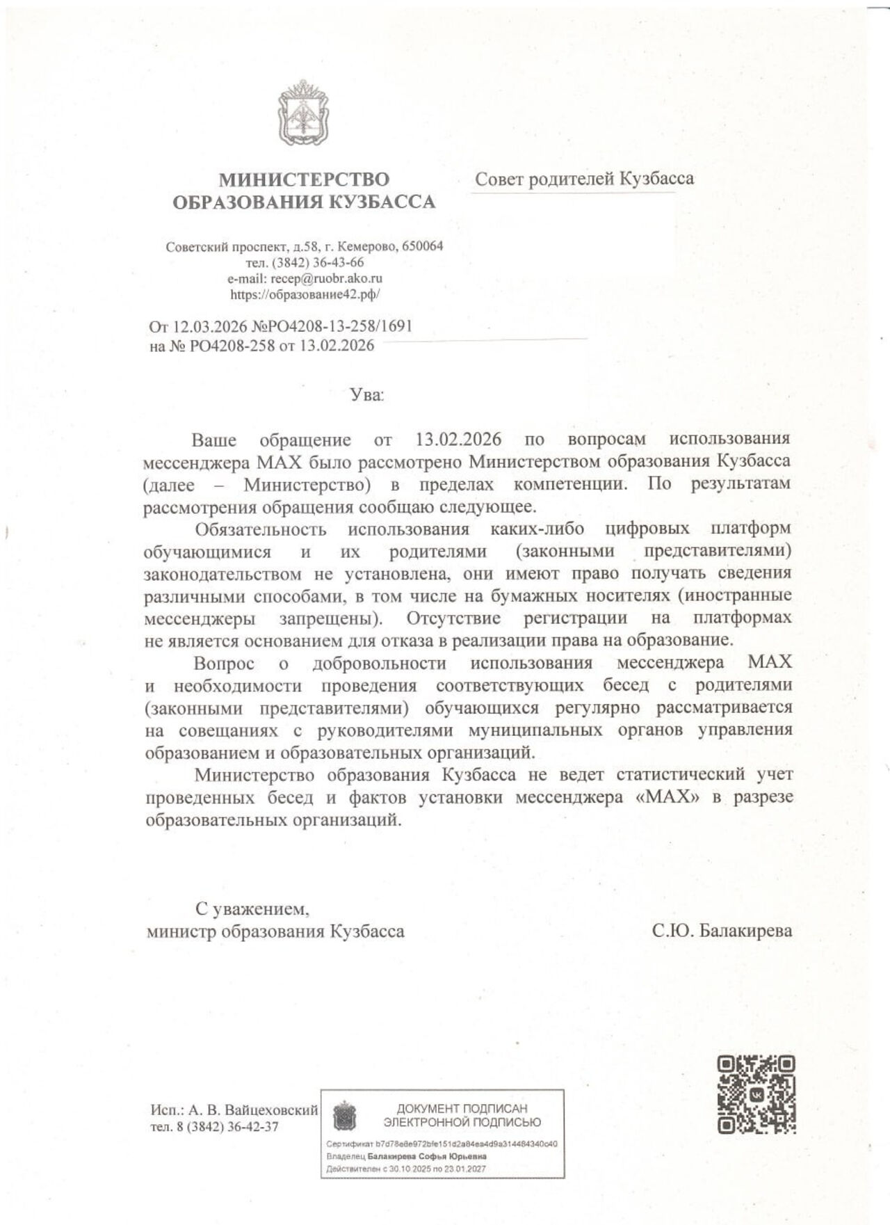 Министр образования Софья Балакирева в официальном ответе "Совету родителей Кузбасса" подтвердила, что нет законных оснований заставлять детей и их представителей регистрироваться в мессенджере MAX. Документ, заверенный электронной подписью, публикует "Сибирский экспресс".