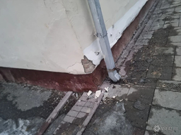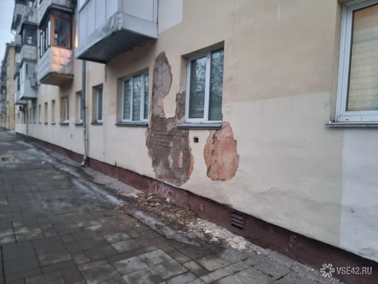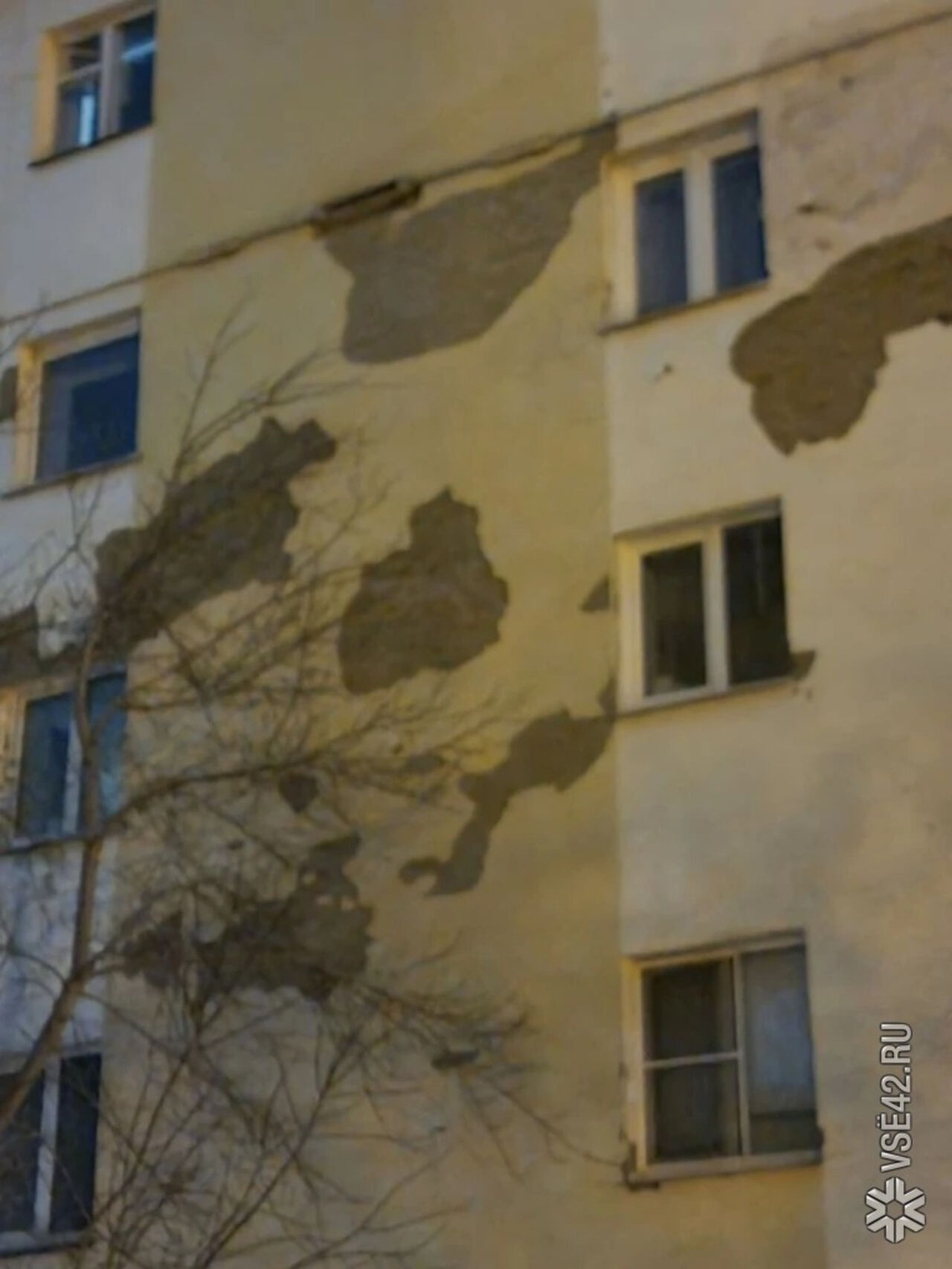 На кадрах видно, как от фасада отвалились куски разных размеров, образовались многочисленные громадные "проплешины" и трещины, местами видна кирпичная кладка.