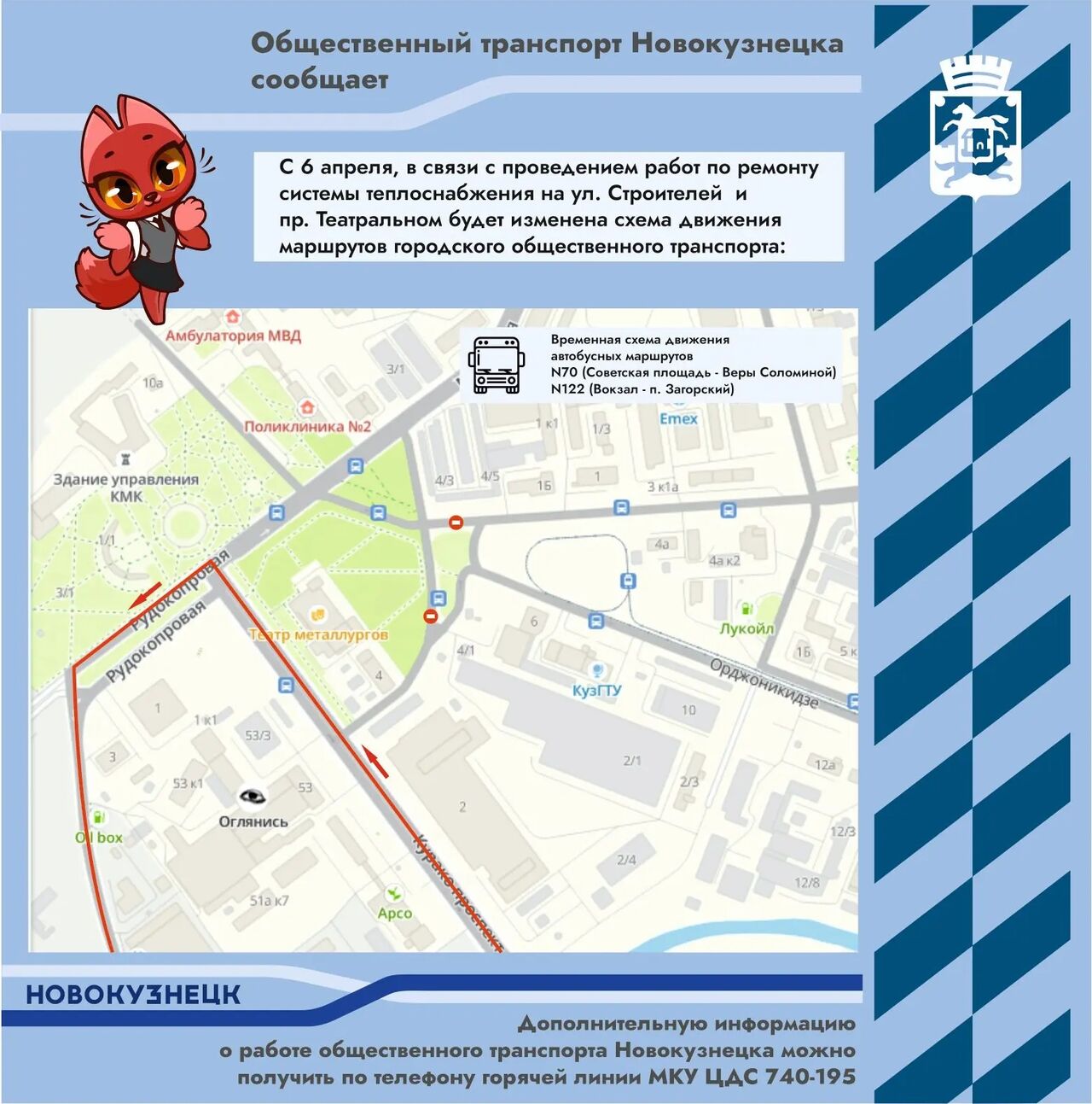 • №122 и №70 в прямом направлении будут следовать через проспект Курако на улицу Рудокопровую. Временная остановка – "Площадь Побед".