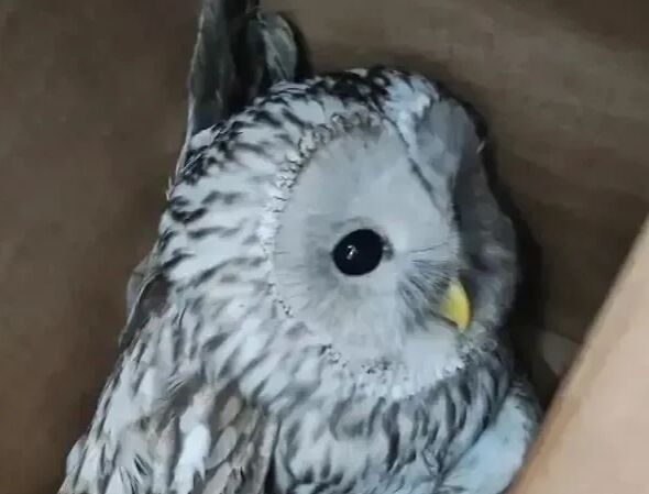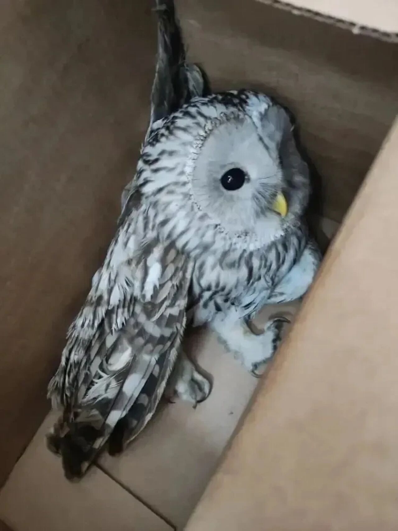 Так, сову отбили от стаи птиц, а потом отвезли к ветеринару.