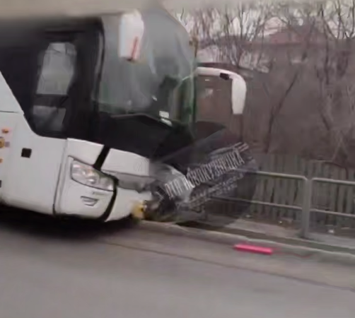 Судя по кадрам, автобус с названием шахты "Юбилейная" получил серьёзные повреждения спереди. Рядом стоит повреждённая легковушка. Участники аварии замерли на обочине дороги, не мешая проезду.