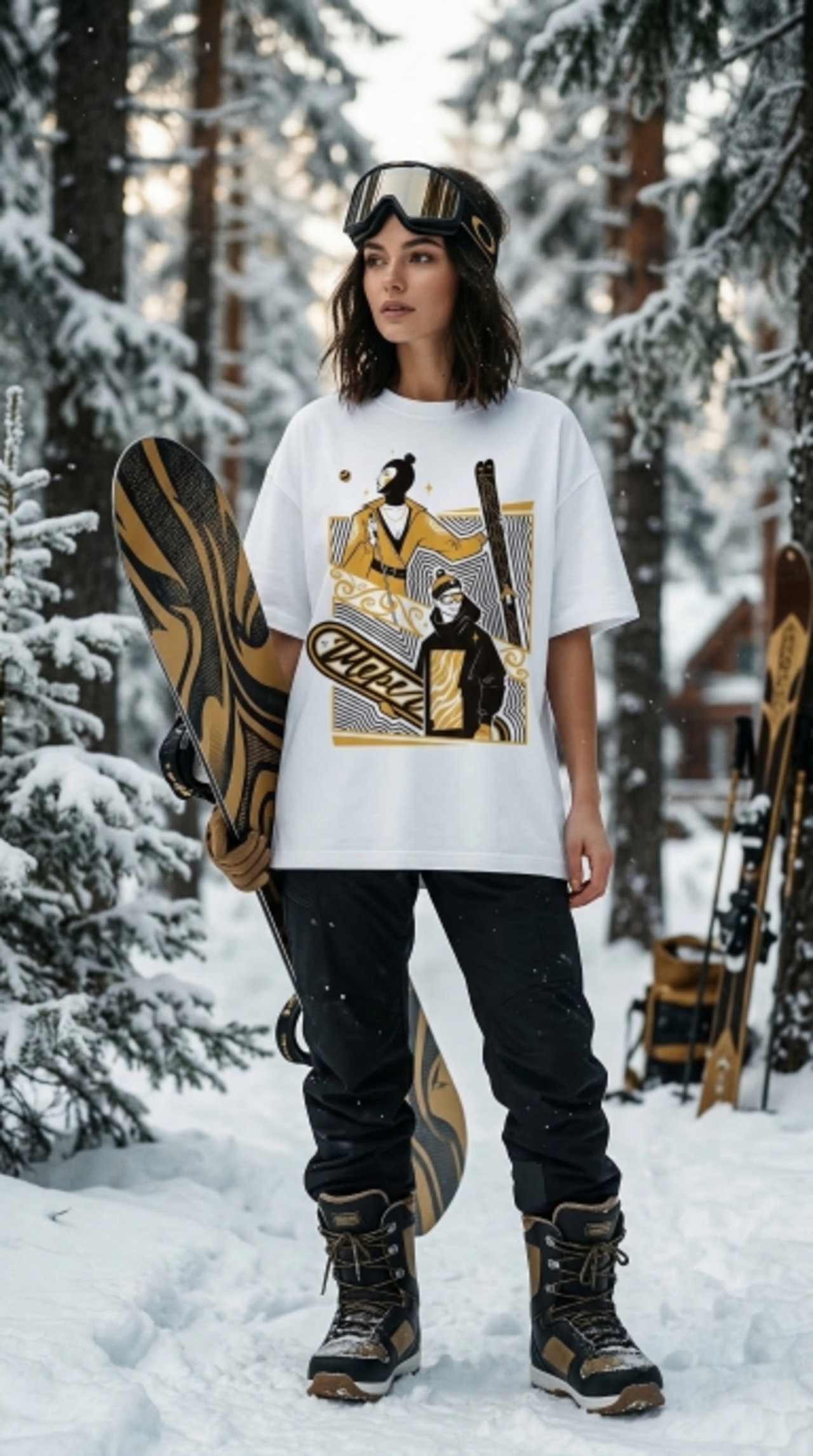 "В основе идеи изображений – две культуры катания. Женщина, одетая в форму прошлых лет – символ более устоявшегося вида спорта, лыж. Мужчина в современной одежде олицетворяет более молодой вид спорта сноуборд. Два разных вида катания, две разные культуры объединены одним местом, одним интересом и одним стилем".