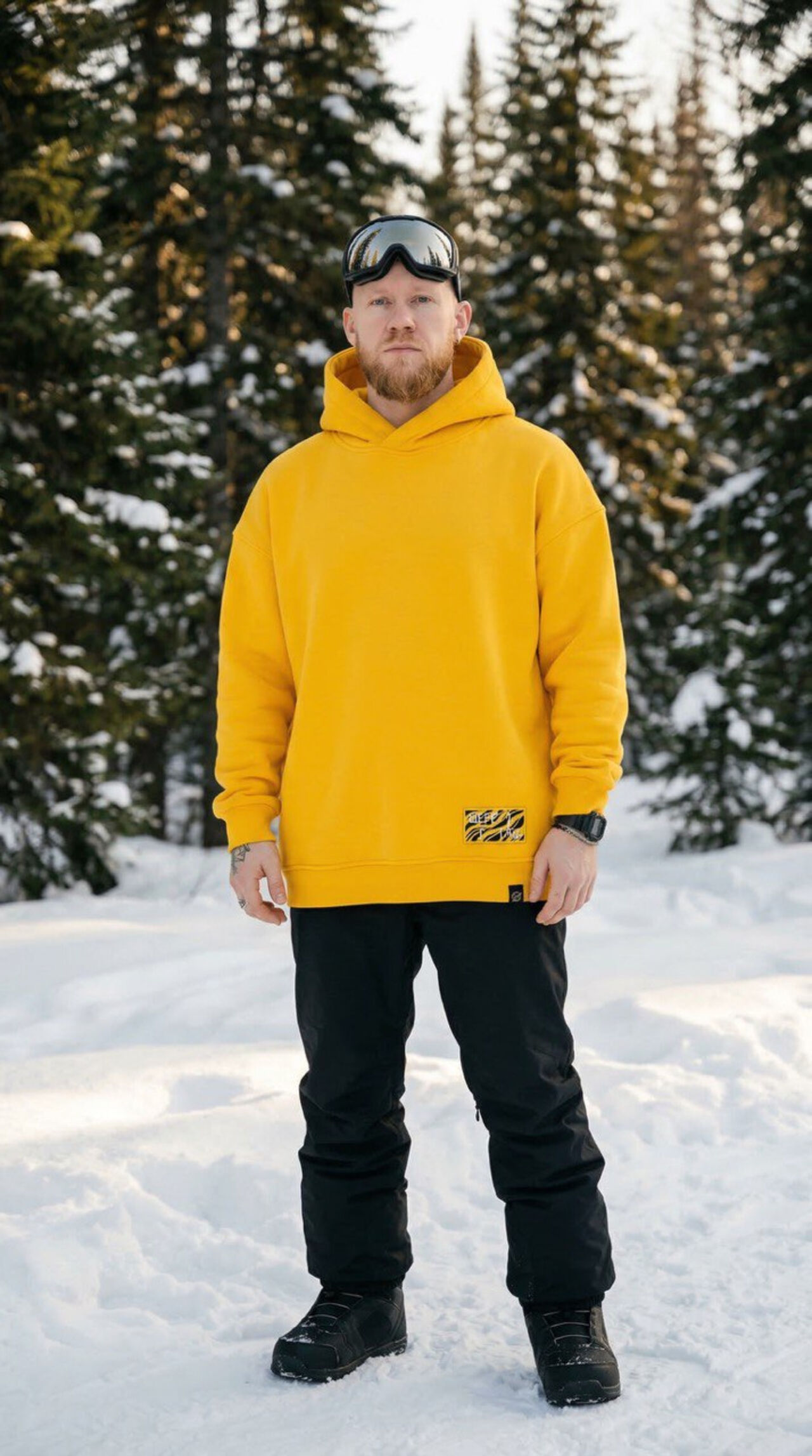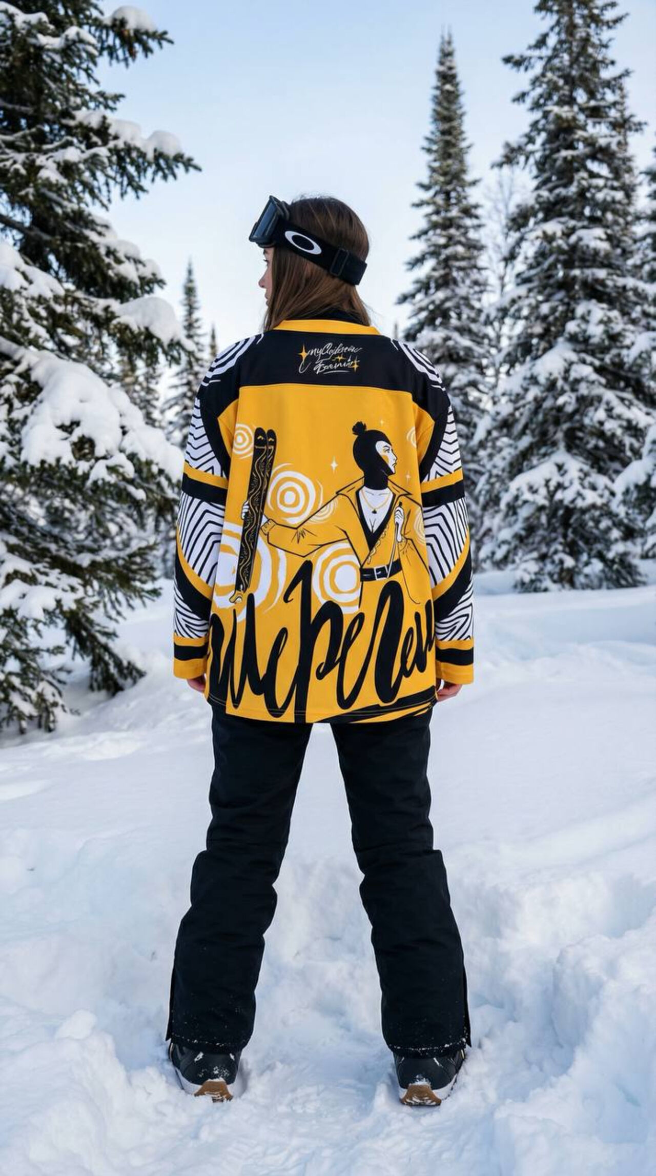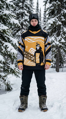 Коллекция представлена сноубордическим джерси, худи, футболкой и панамой. Вещи подойдут как парню, так и девушке. Одежда выполнена с преобладанием черно-желтых цветов Билайна, что превращает ее в выразительный акцент на фоне белоснежного пейзажа.
