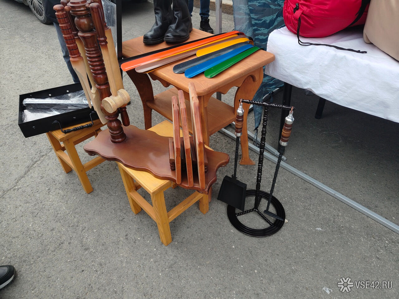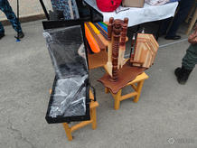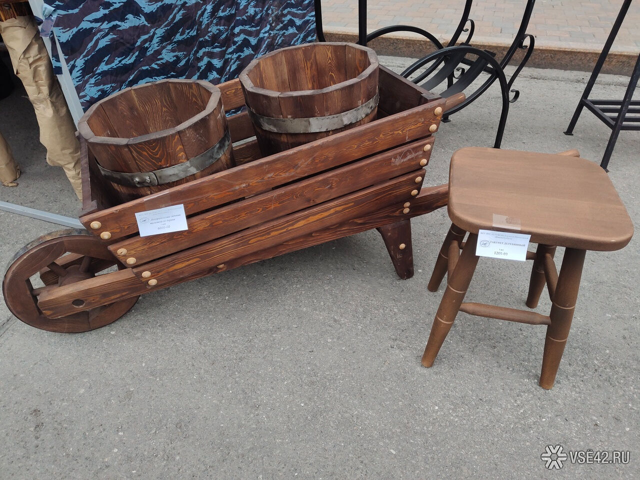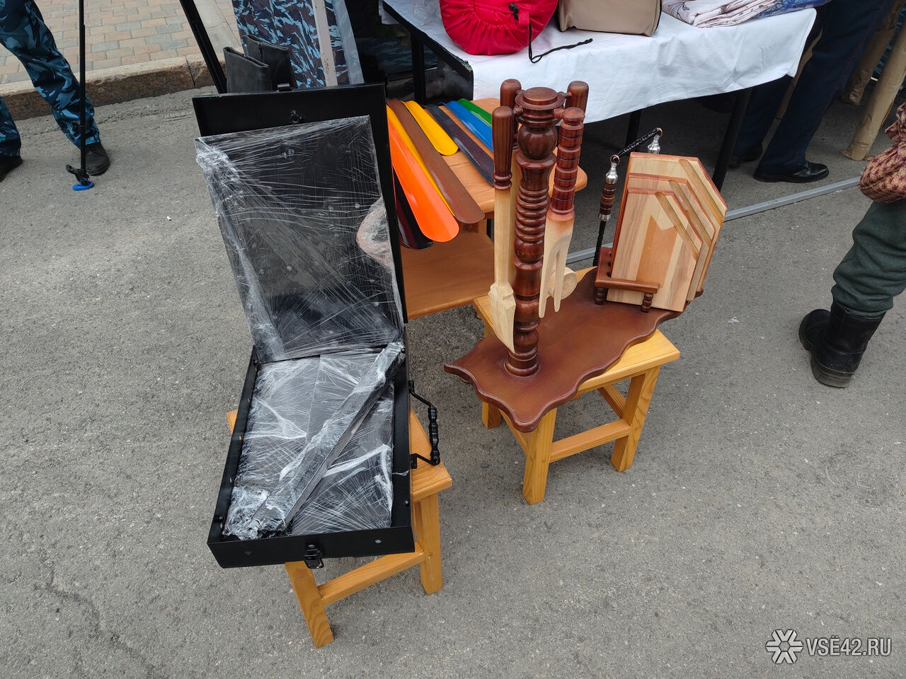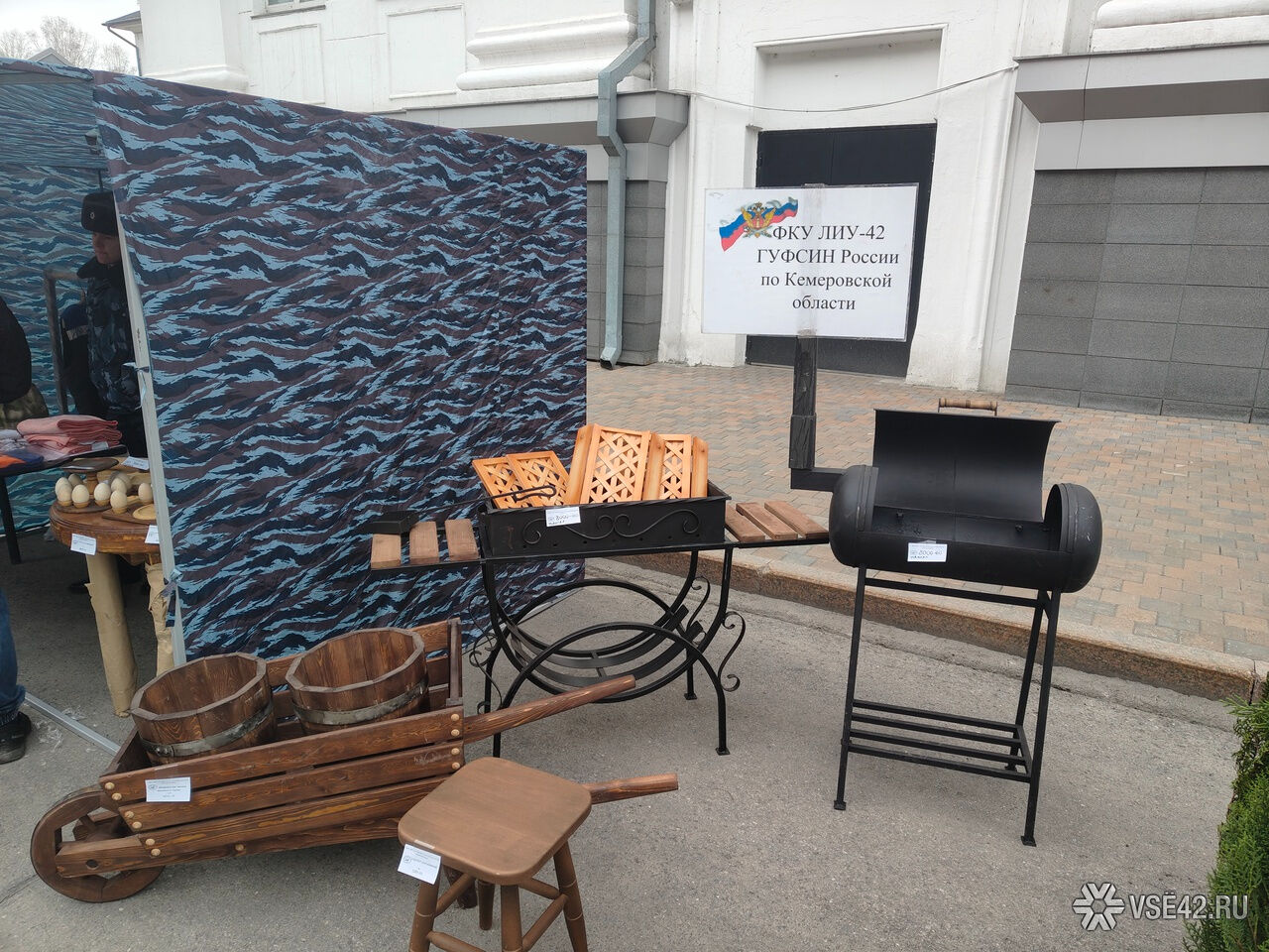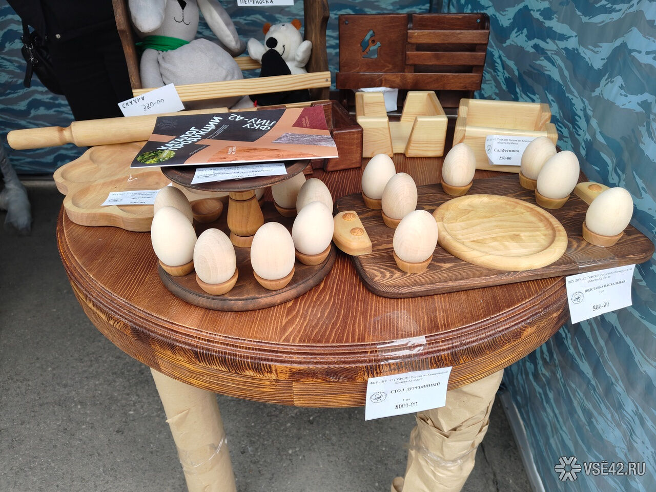 Корреспондент VSE42.Ru посетил палатку ФСИН на ярмарке. Из необычного замечены декоративная садовая тележка из дерева, складной переносной мангал, спальный мешок, подставки для яиц, мягкие игрушки, а также накидка на лобовое стекло автомобиля. В ведомстве подчёркивают, что всё это зэки изготавливают своими руками, в том числе сливочное масло, которое пользуется особенной популярностью.