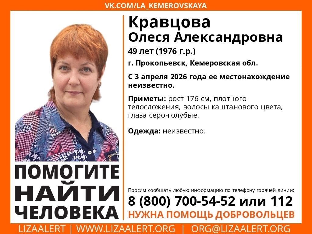 Волонтеры ПСО "ЛизаАлерт" сообщили, что в Прокопьевске пропала 49-летняя Кравцова Олеся Александровна. С 3 апреля 2026 года ее местонахождение неизвестно.