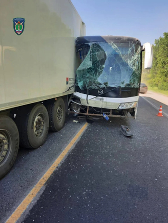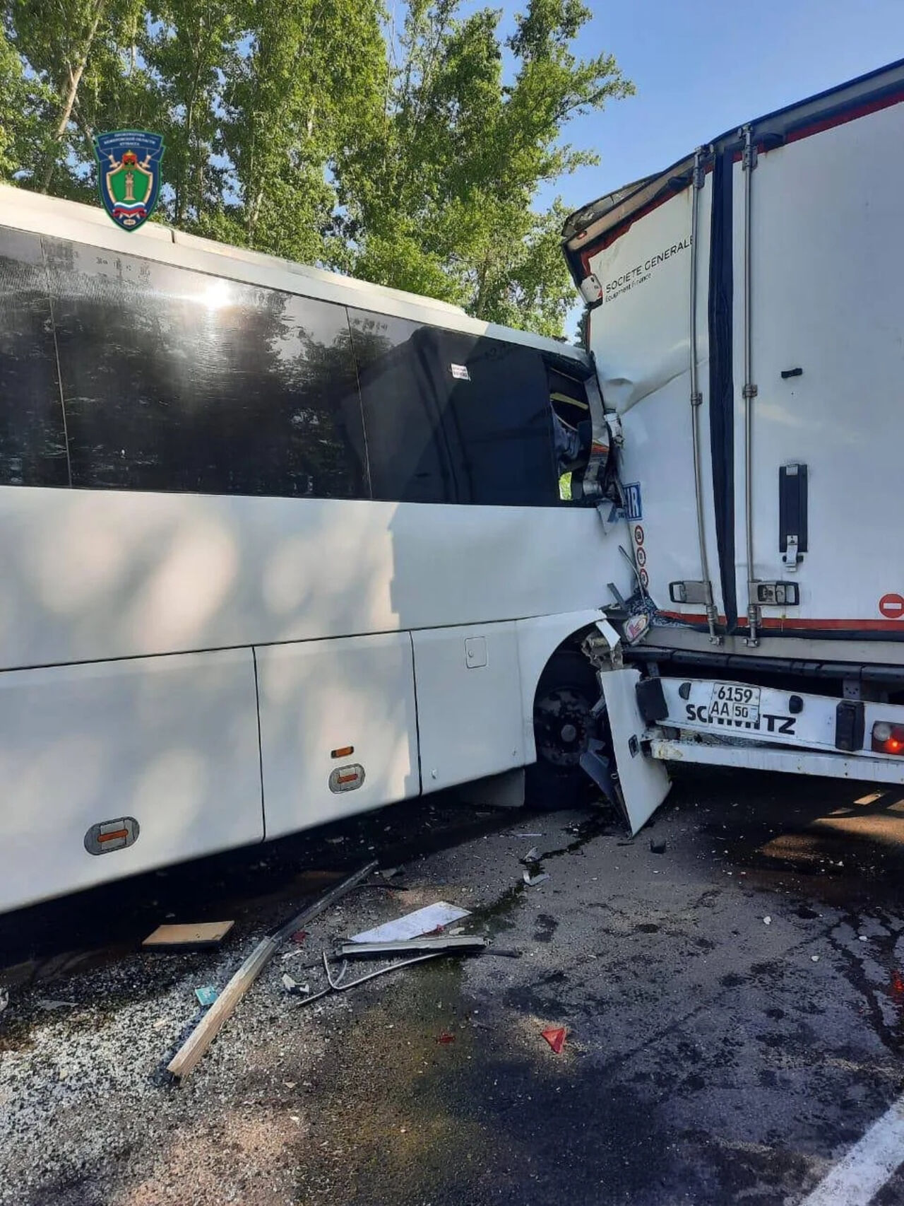 В Топкинском округе водитель междугороднего автобуса не заметил сужение дороги из-за ремонта и на полном ходу врезался в стоящий тягач.