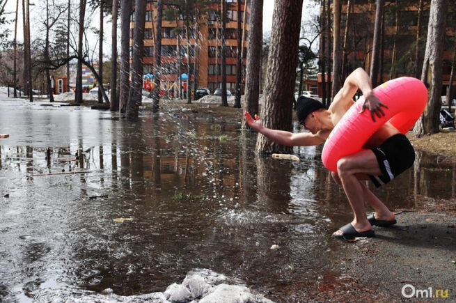Житель Новосибирска решил "искупаться" в луже в Тимирязевском сквере. По его словам, этот водоём появляется там каждый год и держится почти до самого начала лета.